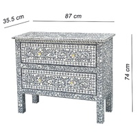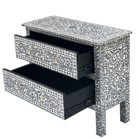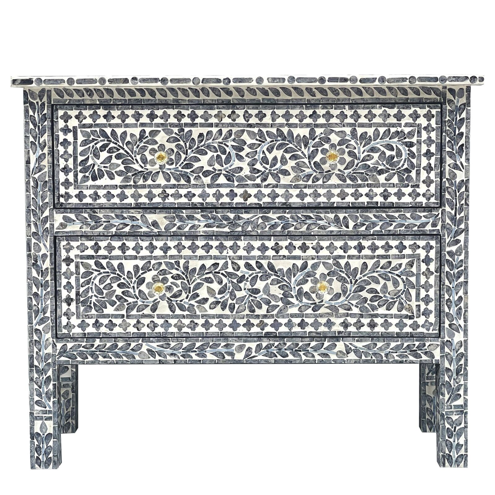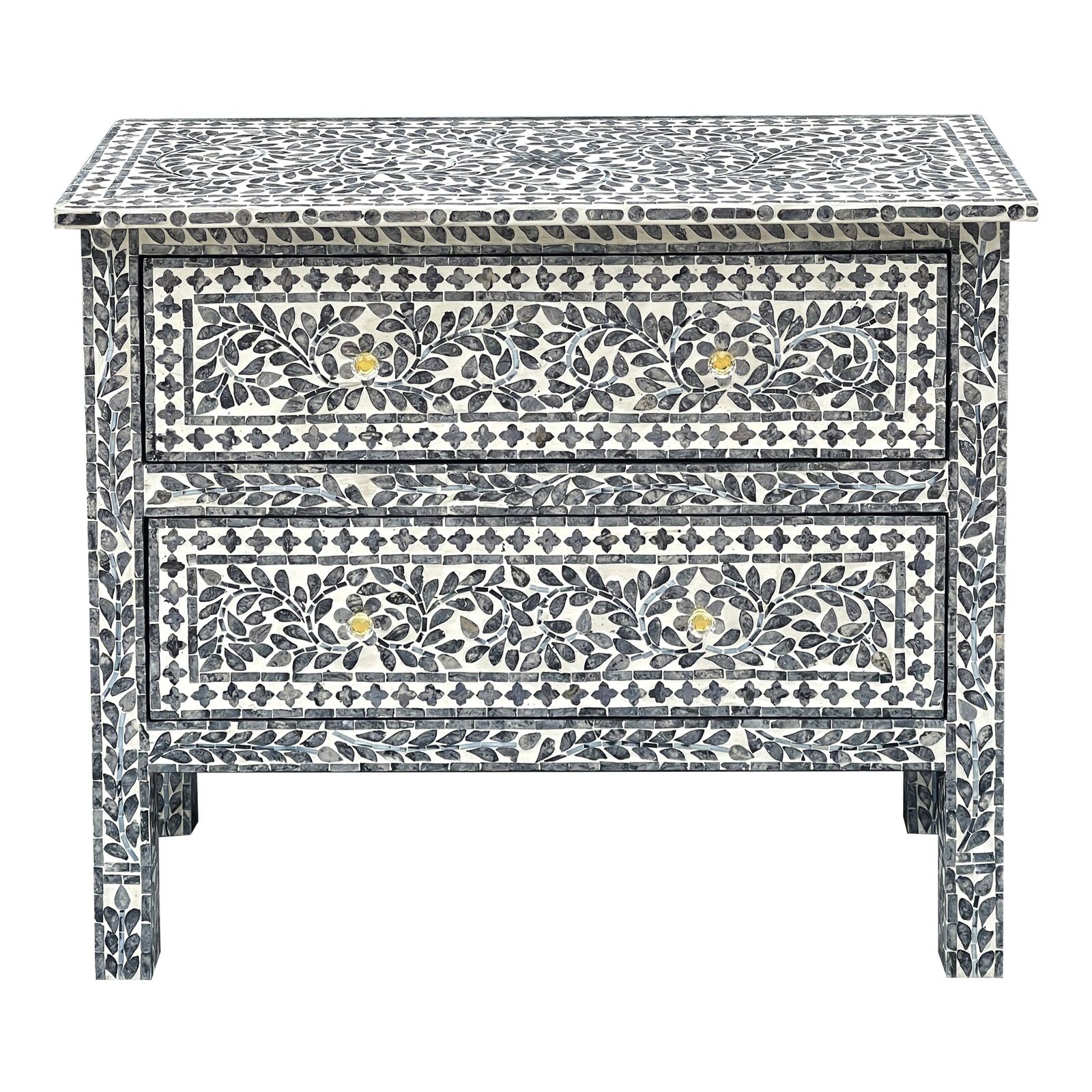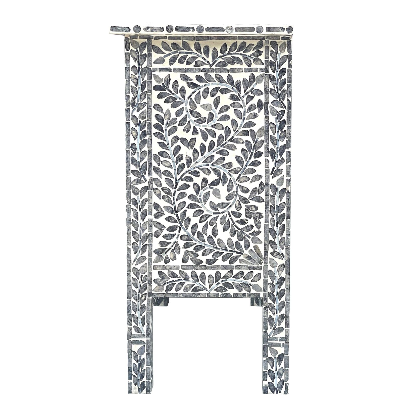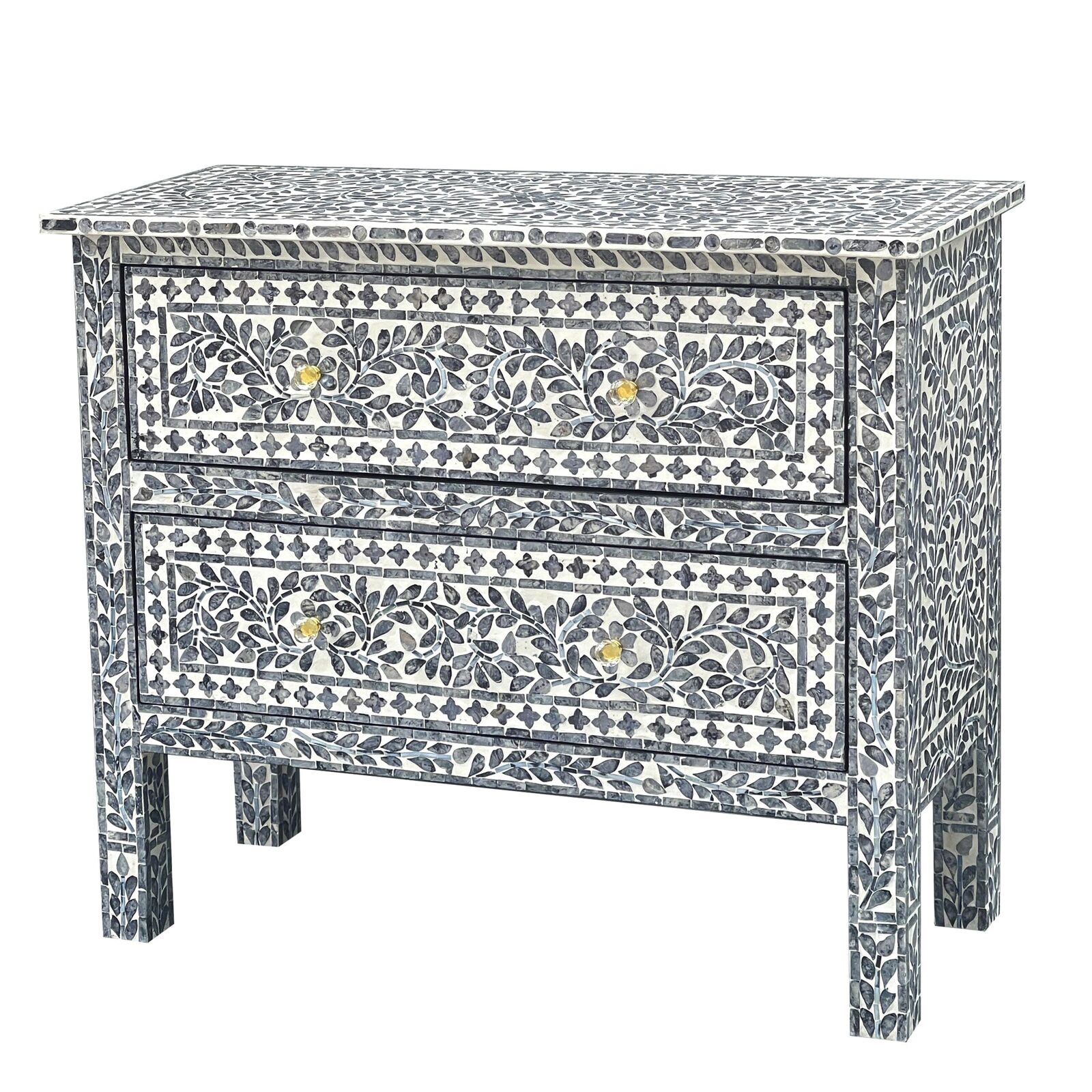Our hand-crafted Mother of Pearl furniture is expertly crafted, imparting each piece with a unique character of its own. Such pieces may bear small markings, smudges, glue spots, and other subtle details all of which contribute to its one-of-a-kind look. Patterns may differ from those shown in its original photos. Note that these details are not faults and are instead part of the charm of such hand-crafted items. To maintain these pieces, they should not be used outdoors, nor should cleaning chemicals be used. Instead, use a lint-free cloth, and also make sure not to place these pieces near heat or sunlight, as this may cause fading.