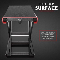 The motorcycle lift stand's lift deck is padded with premium rubber for extra durability and stability. Manufactured and tested to meet all current safety standards.
