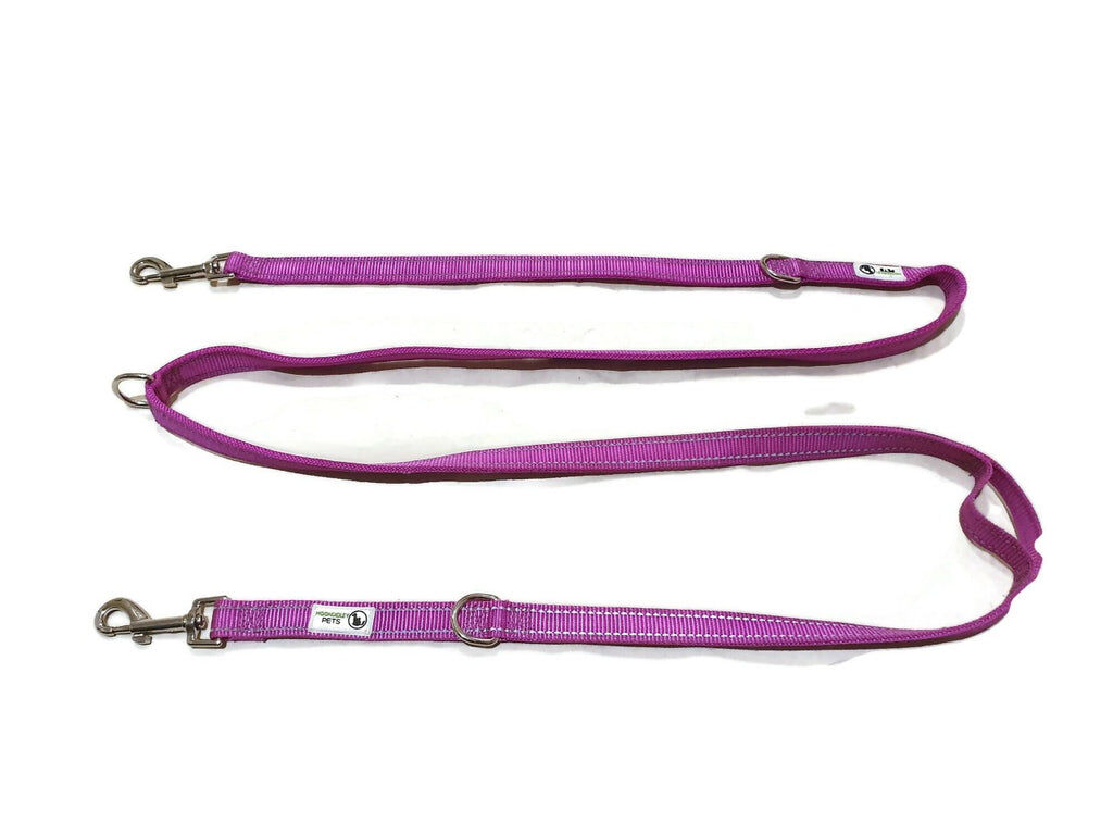 Multi Dog Lead - Nylon w/Reflective Stitching - Double Clip ,Coupler, Waist Belt, Short/Long, Quicktie - Moondidley Pets 20mm Purple