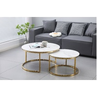 $502.89The Nesting Style Coffee Table in White on Gold Stainless Steel is a stylish and functional piece of furniture that features a white marble top with a stainless steel frame finished in gold. The table comes in two sizes, with the smaller table fitting neatly underneath the larger one to save space when not in use. Each marble top finish might vary in pattern, making each piece unique.