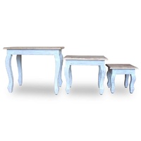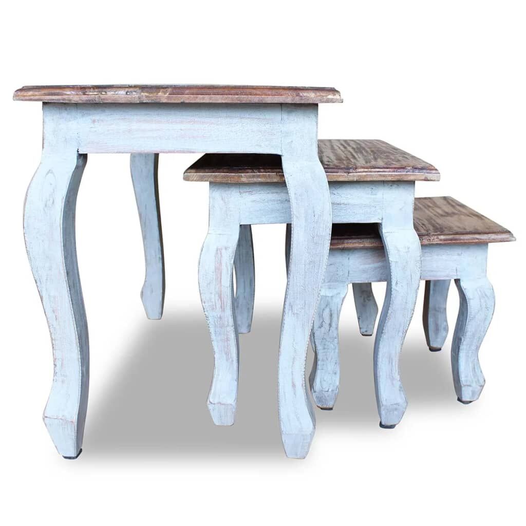 These antique-style wooden nesting tables in an elegant design will add a sophisticated touch to your home. Made of solid mahogany wood, this solid wood side table is exceedingly durable and sturdy. Mahogany is a tropical hardwood, standing out with its beauty, durability and color. Special craftsmanship has been used to give this item a vintage.warm and authentic look. You may find cavities left by nails, screws, or bolts, along with other imperfections, underlying the authenticity of the material. These imperfections disclose a rich history and are never intentionally made. The wood originates from naturally fallen trees, wooden boats, wooden houses, etc. Every piece of furniture is unique, and slightly different from the next. Signs of wear and the craftsmanship of these fully-handmade nesting tables give each piece a unique look and add to its spectacular vintage style. Every step of the process is carried out with the greatest care. Delivery includes 3 nesting tables in different sizes. Important note: The colours may vary from piece to piece, making each of our side tables unique. The delivery is random, ensuring the exclusivity and individuality of your product.