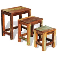This antique-style wooden reclaimed wood set of 3 nesting tables is a timeless living accessory for your home. They can be used as side tables, coffee tables, lamp/plant stands, etc. Being stackable, these tables save a lot of space when not in use. This exotic set of 3 nesting tables is made from reclaimed wood, which means that every piece of furniture is unique and slightly different from each other. The furniture made from reclaimed wood has characteristics of different wood like teakwood, acacia, mango wood, saal wood etc. Reclaimed wood is solid, stable, durable and beautiful. The nail holes or clear-faced grains bring their history with them and invite another generation to permeate them with their own. Keeping this set of furniture at home will show your concept of resource conservation, environment protection and sustainable development. In addition, pure handmade craftsmanship adds the vintage spectacular style to the coffee table and feasts you with exoticism. Every process of recombining, polishing, painting and waxing is elaborately prepared. Important note: Colours vary from piece to piece, making each of our nesting tables unique. The delivery is random, ensuring the exclusivity and individuality of your product.