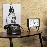 Modern space-age design fuses with mid-Century retro style in the Henry mantel clock. A rectangular case coated in matt black silicone holds a cream dial. The contemporary mantel clock stands on elongated angled legs.