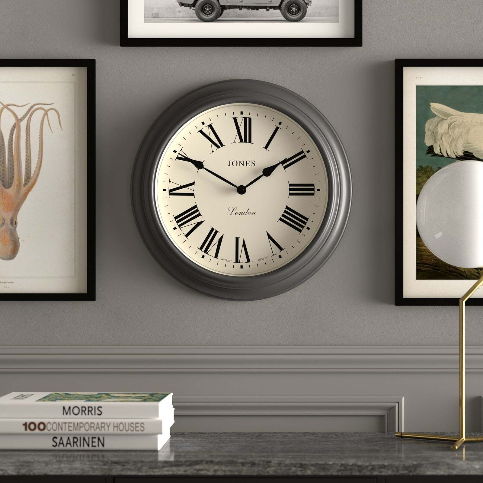 A classic green Roman numeral wall clock. The decorative moulded case is finished in matt 'Moss Green' with grey metal spade hands and a flat glass lens.
