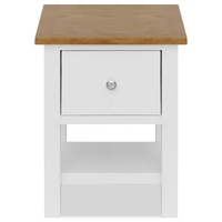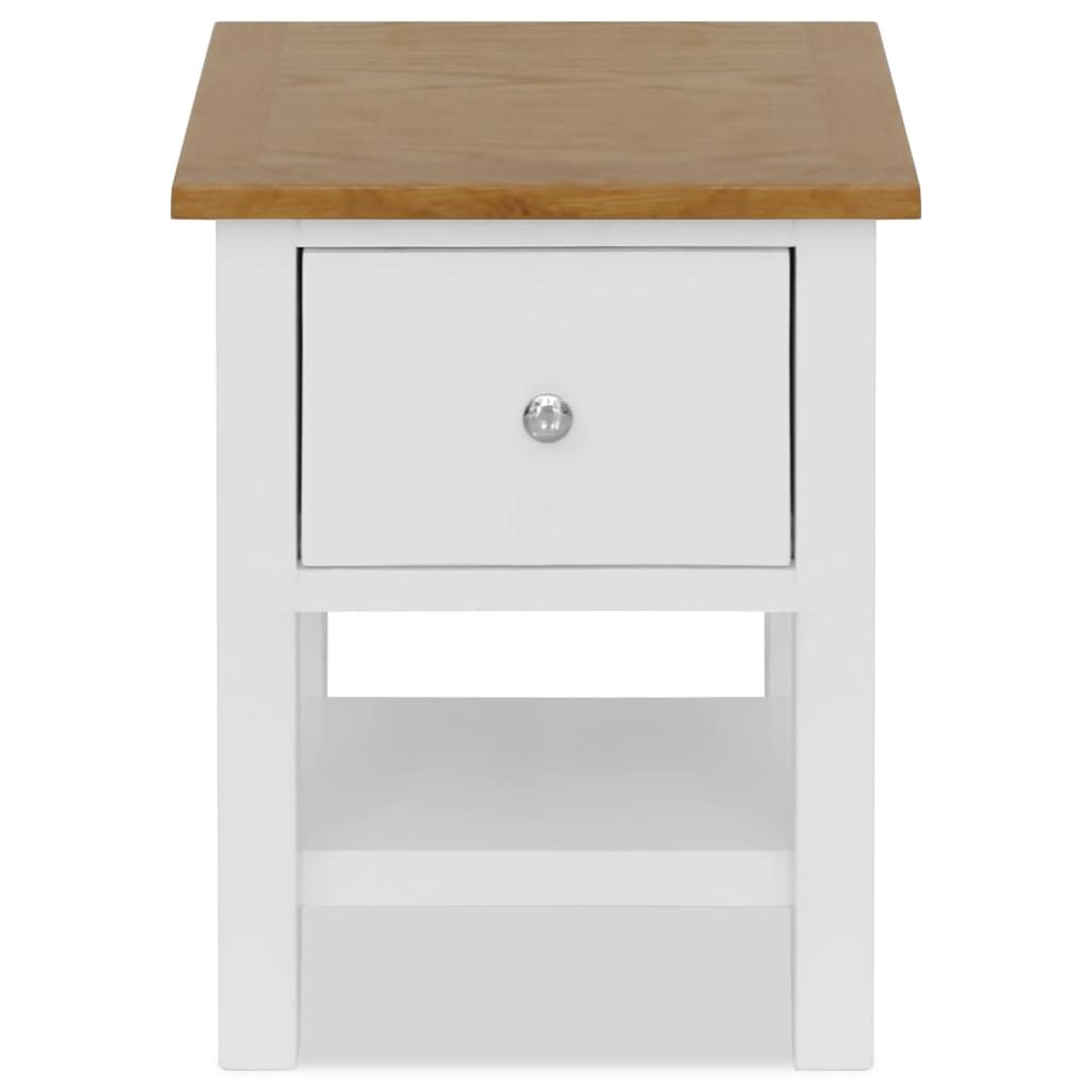 Our two-tone wooden nightstand will give your bedroom decor an elegant touch with its timeless design. The nightstand has a solid oak top, which adds to its sturdiness and durability. The oak has beautiful wood grains that exude a natural charm. The frame is made of solid pinewood with a white finish and boasts a contemporary style. Thanks to its compact design, this nightstand doesn't take up much space but is very practical. It will be perfect for keeping and displaying your bedtime essentials, and will help keep your room tidy. It can also be used as side table, end table, coffee table, or a telephone or plant stand. Note: the item is delivered fully assembled.