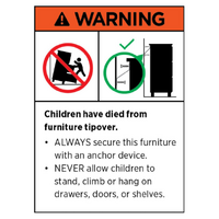 ⚠️ WARNING Children have died from furniture tipover. ALWAYS secure this furniture with an anchor device. NEVER allow children to stand, climb or hang on drawers, doors, or shelves.