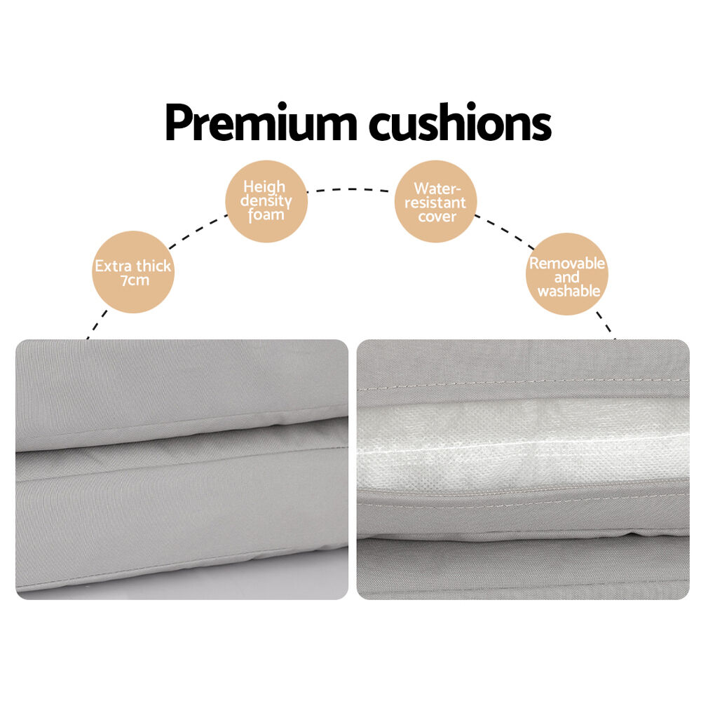 $376.93Experience the best the outdoors has to offer with this Gardeon 5-piece Outdoor Dining Set. Featuring four single chairs and a matching dining table, this set is perfect for sitting outside and watching the world go by in comfort and style. The set is made using powder-coated aluminium for rust and water resistance and handwoven rope for style, while the outdoor cushions feature water and UV-resistant covers and thick 7cm high-density foam for comfort. It is easy to assemble and features non-slip feet to keep everything in its place. The coffee table features a durable tempered glass tabletop to hold all of your favourite drinks, reading materials or outdoor games. Maintenance is as easy as wiping down the furniture, and you can remove the cushion covers for even easier cleaning. So what are you waiting for? Make the most out of the beautiful weather with a Gardeon 5-piece Outdoor Dining Set.