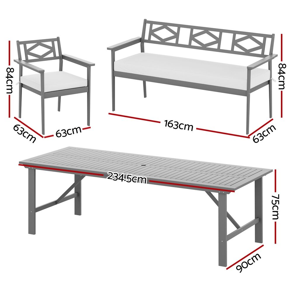 $607.23With summer fast approaching, you can once again join the sunshine with the Gardeon Outdoor Dining Set. Made from solid Acacia wood with a strong and durable grey finish, the set is designed for outdoor or indoor use in a wide range of weather conditions. The table and chairs are designed to comfortably seat 6 people across a wide bench and three single chairs. The stable structure features fixed safety screws, giving the bench a 450kg weight capacity, 150kg weight capacity per chair, and a table capacity of 45kg. The seats are classically designed and completely comfortable with an inclined diamond-shaped backrest, comfortable handrails, and 5cm thick foam cushions. The cushions feature removable and washable covers for easy cleaning. Relax under the sun with a versatile parasol hole in the middle of the table. With easy and hassle-free assembly the Gardeon Outdoor Bar Set is the perfect addition to any backyard, patio or even sitting room.