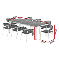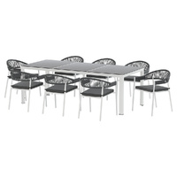 $937.17Experience the best the outdoors has to offer with this Gardeon 9-piece Outdoor Setting. Featuring eight single chairs and a matching dining table, this set is perfect for sitting outside and watching the world go by in comfort and style. The set is made using powder-coated steel and meticulously hand-woven rope for rust and water resistance, while the removable outdoor cushions feature water-resistant fabric and thick 5cm high-density foam for comfort. The chairs have a slanted backrest and handrails to keep guests comfortable for hours on end. It is easy to assemble and features non-slip feet to keep everything in its place. The dining table features a stylish tempered glass tabletop that is gorgeous to look at, easy to maintain and generous enough to hold all of your favourite drinks, reading materials or outdoor games. Maintenance is as easy as wiping down the furniture with a damp cloth. So what are you waiting for? Make the most out of the beautiful weather with a Gardeon 9-piece Outdoor Dining Setting.