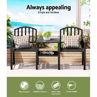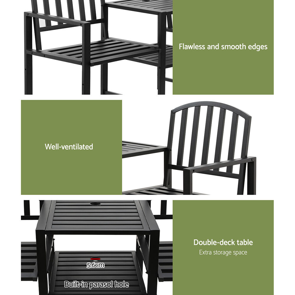 $162.61With its modern rustic vibes, the Gardeon 2-Seater Garden Bench is the perfect outdoor tete-a-tete set to spend the day with your friends. Made from black steel with an impeccable weather-resistant finish, the bench has a strong structure with a smooth, easy-to-clean surface and curved edges. With two integrated armchairs, an adjoining table and a double-deck design, the bench has plenty of sitting and extra storage space. A built-in parasol hole will fit an outdoor umbrella and keep your guests dry and in the shade. The classic design ensures your comfort is always forefront and the trending style will stand the test of time. Enjoy the outdoors this season with a Gardeon 2-Seater Garden Bench.