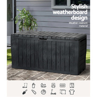 $93.05Looking for some extra storage space for your garden or outdoor essentials and tools? Gardeon has you covered with this stylish and versatile Outdoor Storage Box. The box is made from durable PP plastic in a weatherboard design that is UV and weather-resistant with an excellent weight capacity. It has a storage capacity of 220L to fit all of your outdoor or indoor essentials. It also features a double-layer construction for extra stability. It flaunts a fantastic 2-in-1 design: you can use it as a storage cabinet and a comfortable outdoor bench. It comes with convenient integrated wheels, moulded handles and a lockable lid to keep out children, pets or other unwanted guests. Easy to assemble and suitable for indoor and outdoor use, you can add style and function anywhere in the home with a Gardeon Outdoor Storage Box.