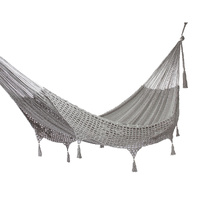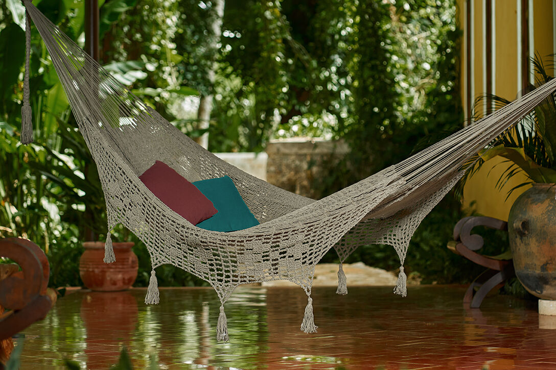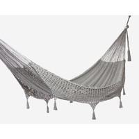 This gorgeous generous-sized hammock will quickly turn into your new favorite afternoon spot. Mayan Legacy artists hand-weave it from 100% cotton rope in elegant colours and add a beautiful crocheted fringe with tassels and floral designs for a glamorous finish. Just add a pair of straps or a frame and enjoy.