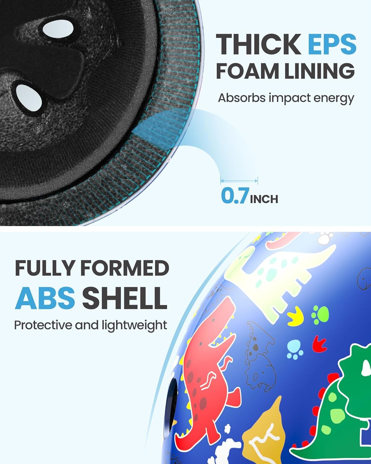 Protect kids with both comfort and impact resistance. REINFORCED ABS SHELL THICKENED SHOCK-ABSORBING EPS CORE provides solid protection when skateboarding, rollerblading, cycling and etc.