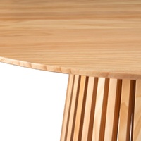 Create a focal point in your dining room with the Edison round dining table. Featuring a pedestal base with a tapered slatted design, this wooden table showcases an intricate and distinctive design inspired by Japandi décor. Finished in a veneer wood, the dining table will add a contrasting look to modern-inspired interiors.