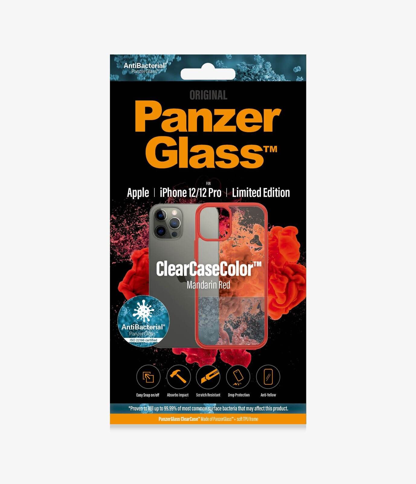 $29.09PanzerGlass?äó ClearCaseColor?äóApple iPhone 12/12 Pro - Mandarin Red Limited Edition (0280) PanzerGlass?äó ClearCaseColor?äó to Apple iPhone 12 and iPhone 12 Pro is the strongest ClearCase?äó from PanzerGlass?äó and protects the beautiful design you paid for. ClearCaseColor?äó Mandarin Red Edition protects the phone from drops, scratches and dust. Produced with PanzerGlass?äó and an extra strong honeycomb frame. The case matches all buttons etc for easy and full access to all functionalities. Slightly swelling bumpers in all corners to enhance protection. Applying a ClearCase?äó does not affect wirelesscharging. Features Most powerful ClearCase?äó ever More than 19% better protecting performance Plastic frame surrounding rear cameras Tempered anti-aging glass back Works w. wireless charging Honeycomb pattern to enhance shock absorption Slim fashionable design Slightly swelling bumpers in all corners to enhance protection