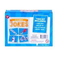 4 Classic jokes. A fun gift for children. Includes; 1 x fake chewing gum, 1 x bug in ice, 1 x nail through finger and 1 x squirt ring.