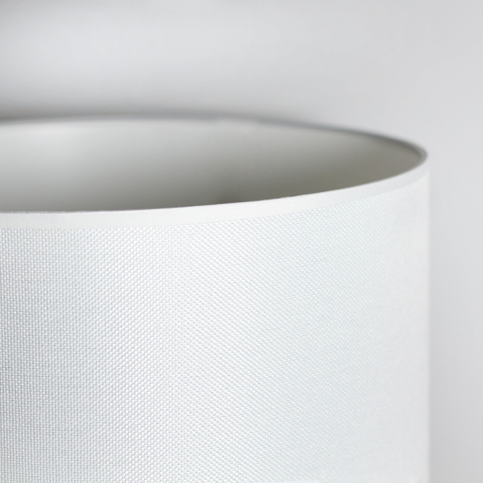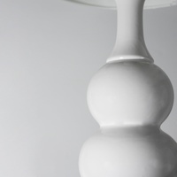 The Pattery Barn Table Lamp utilises a classic pottery wheel inspired ceramic base design with two spherical features and a spindle-shaped neck. The cylindric white fabric lampshade is supported on a short chrome stem.