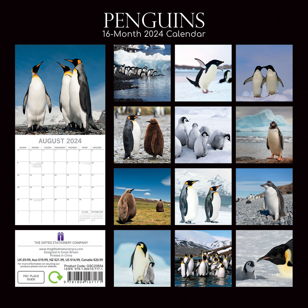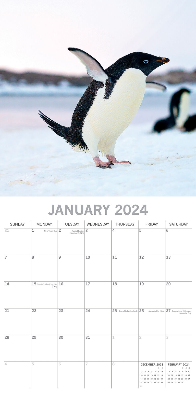 Enjoy Penguins all year long with this Penguins Wall Calendar. This calendar is perfect as décor in your home, kitchen, or office and easily helps to keep track of important dates, contacts, and other events at a glance. Each calendar month is easy to glance at and see what responsibilities you have coming up, so make sure you stay organized through the year! Personalization is easy with different colors for appointments and trips, add stickers or stickie notes for a quick reference, or create your own system of symbols and abbreviations. Printed on high quality paper this calendar will brighten up any room. Brand New Calendar with Beautifully design, Sealed in Original Packaging, each calendar includes a large grid running from Sunday to Saturday. Publisher: The Gifted Stationery Co. Dimensions: 30cm (w) x 30cm (h) closed; 30cm (w) x 60cm (h) opened Time Span: 16 months (January to December 2024 monthly, September to December 2023 on-a-page) 2024 Square Wall Calendar featuring beautiful colour photographed images for every month of the year. Like most Wall calendars, this one comes with: