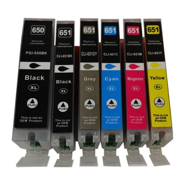Set contains the following Premium Generic Cartridges : 1 x PGI-650XL Black Cartridge, 1 x CLI-651XL Cyan Cartridge, 1 x CLI-651XL Magenta Cartridge, 1 x CLI-651XL Yellow Cartridge and 1 x CLI-651XL Photo Black Cartridge and 1 x CLI-651XL Grey Cartridge