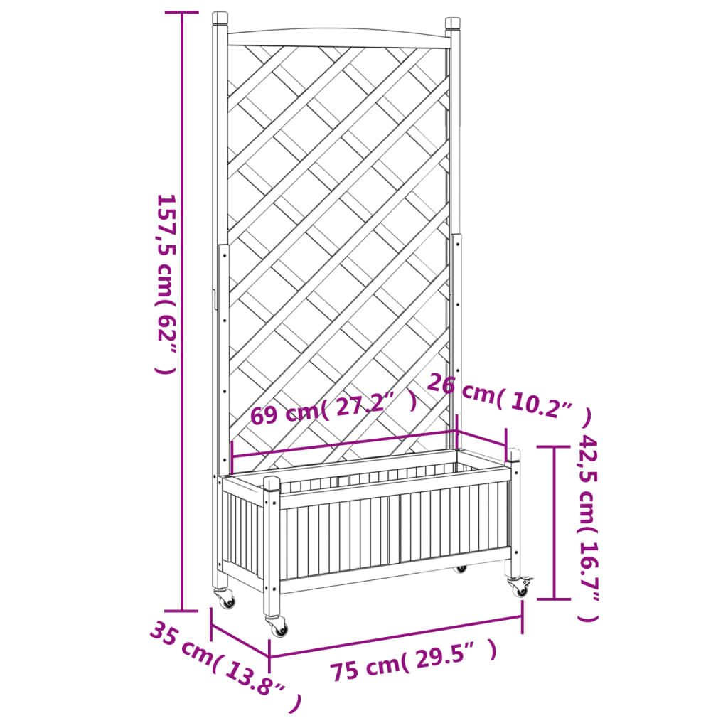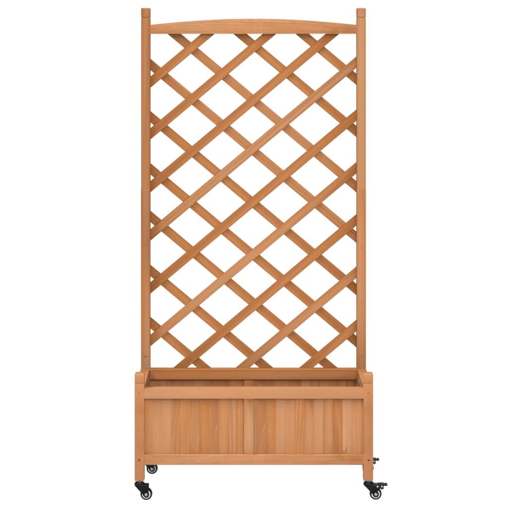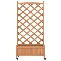 This wooden planter with trellis and wheels is an excellent choice for climbing plants in your garden, patio and terrace. Solid fir wood: Solid fir wood is a beautiful and durable material that maintains its integrity even when exposed to moisture. It does not dry out or warp, making it a reliable choice.Sufficient space: This garden planter is wide and deep enough, providing ample room for growing a variety of plants, flowers, and vegetables. Additionally, the hollow bottom allows for good ventilation and drainage.Trellis fence panel: The patio planter comes with a beautiful trellis fence panel that is perfect for supporting climbing and hanging plants like roses, ivy, or vines. It also adds a stunning visual feature to your outdoor space.Convenient wheels: The solid wheel helps to easily move around your planter when the wheel is attached.Wide applications: This outdoor planter is designed with a round top bar, giving it a stylish and elegant appearance that complements any outdoor space. It can be placed in a patio corner or leaned against a wall or fence. Good to know:The delivery includes the planter only; the liner is not included.