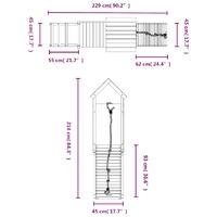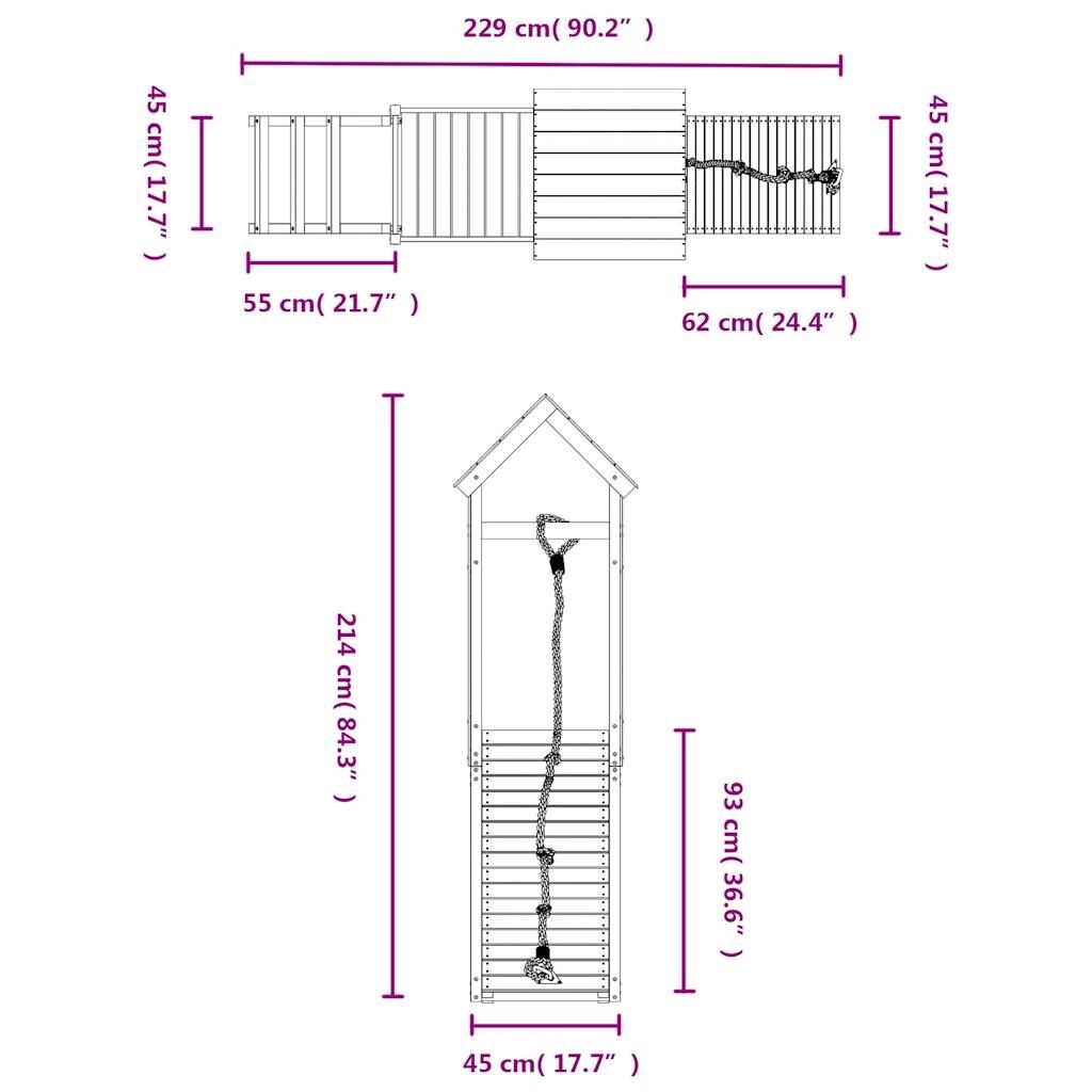 Do you want to give your children the freedom to play at home? This wooden playhouse transforms your backyard into a playground for imaginative adventures! Durable material: This climbing frame with slide is made of solid pine wood. Solid pine wood is a beautiful natural material. Pine wood has a straight grain, and the knots give the material its signature, rustic look. Sturdy and stable frame: The wooden frame of the garden climbing frame ensures sturdiness and stability. Multi-activity centres: The climbing frame features a 90 cm height platform and stands out with a ladder, a sandpit, and climbing wall with a rope. Your little ones can also invite their friends to join the fun. Thoughtful design: The surrounding wooden railings are designed to ensure the safety of children during their happy play. Also, the wooden roof provides shade for your children on hot summer days. Endless fun: This fun-filled wooden outdoor playhouse is the perfect way for your children and their friends to enjoy entertainment, have more interactive time and make memories for you and your children! Warning:Only for domestic useOutdoor use Not suitable for children under 3 years Recommend user age: 3-8 years old Maximum per user weight: 45 kg Good to know:To make assembly as easy as possible, each product is delivered with a manual.