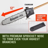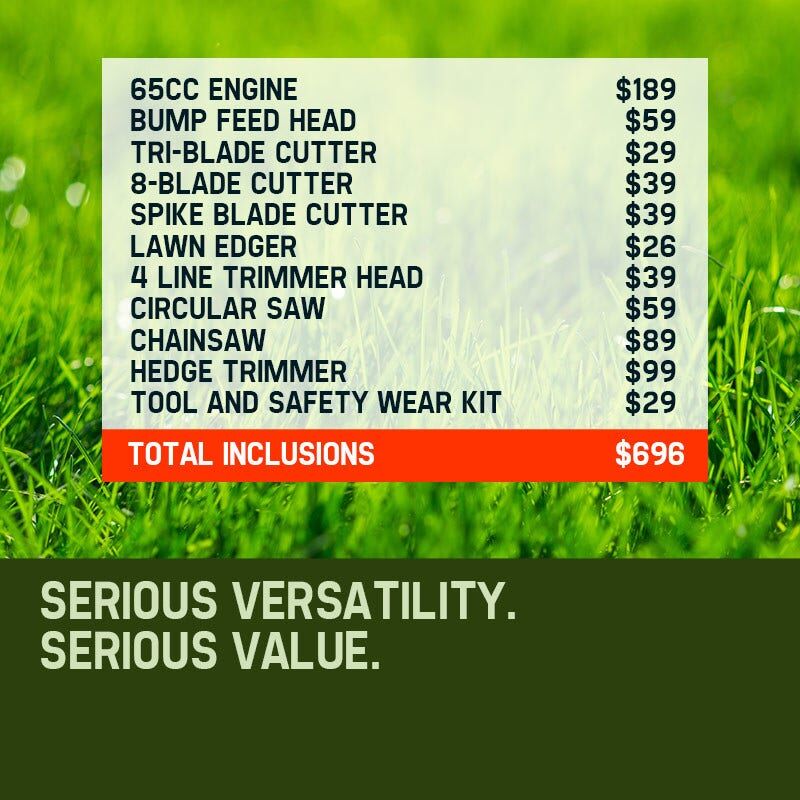 Utilising premium anodized commercial alloy, your Baumr-AG features commercial grade quick connect couplings equipped with dual ball-bearing floating centres. While its extensions reach from 2.3 up to a massive 4 metres, genuine commercial nine spline fastening ensures maximum stability - a must for safely tackling those hard to reach branches. Built tough, your Baurm-AG boasts unparalleled levels of quality backed by an extensive 12 month warranty. Buy now and this amazing package comes loaded with a bonus accessory kit, including protective goggles, gloves, earmuffs, mini toolkit and fuel mixer.