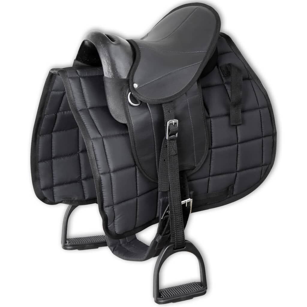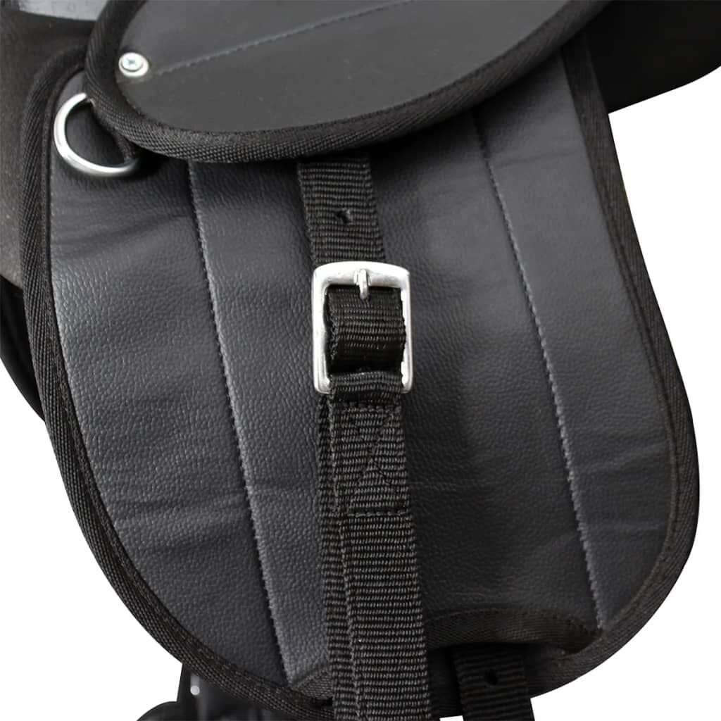 This saddle set, including a saddle, a saddle blanket, stirrups, stirrup belts and a girth, is designed to place the rider in the correct position, thus ensuring a secure and balanced ride. This saddle is designed with a combination of aesthetics and practicality. It is reinforced at all pressure points for added durability. The saddle blanket, made of polyester, is well padded for the horse's comfort and can be detached for easy cleaning. The stirrups, made of high-quality plastic, are solid enough for years of service. The stirrup belts and the girth are firm to ensure your riding safety. This light seat is comfortable enough to last you long hours out on the trail. In addition, it’s quite easy to saddle up.