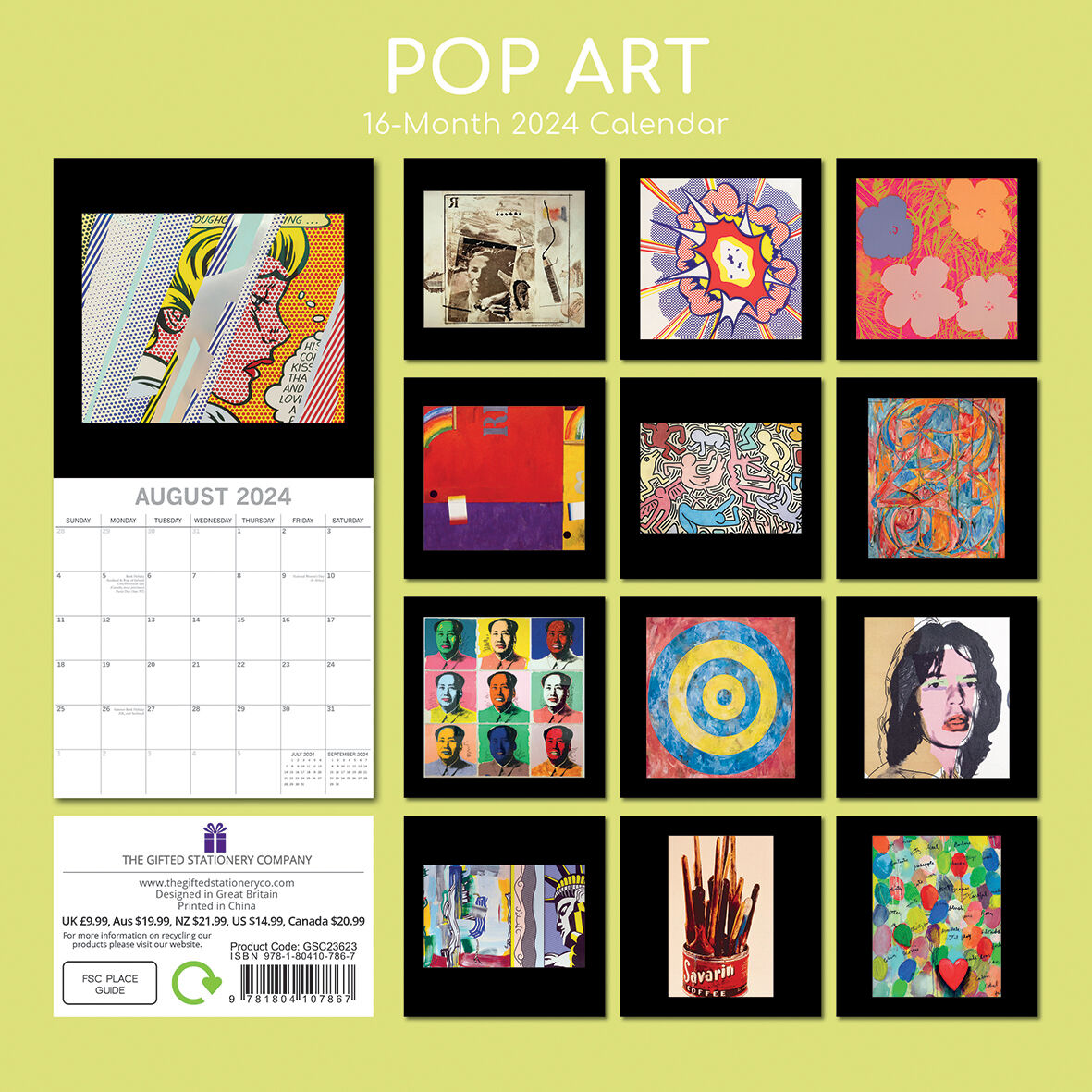 Celebrate the bold vibrancy of the "Pop Art" movement with our 2024 calendar. Filled with iconic artworks, it captures the cultural revolution of the 20th century with its striking imagery. Brand New Calendar with Beautifully design, Sealed in Original Packaging, each calendar includes a large grid running from Sunday to Saturday. Publisher: The Gifted Stationery Co. Dimensions: 30cm (w) x 30cm (h) closed; 30cm (w) x 60cm (h) opened Time Span: 16 months (January to December 2024 monthly, September to December 2023 on-a-page) 2024 Square Wall Calendar featuring beautiful colour photographed images for every month of the year. Like most Wall calendars, this one comes with: