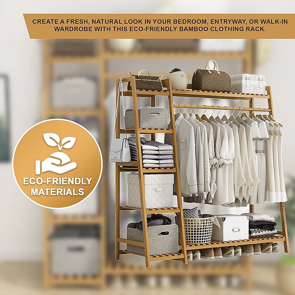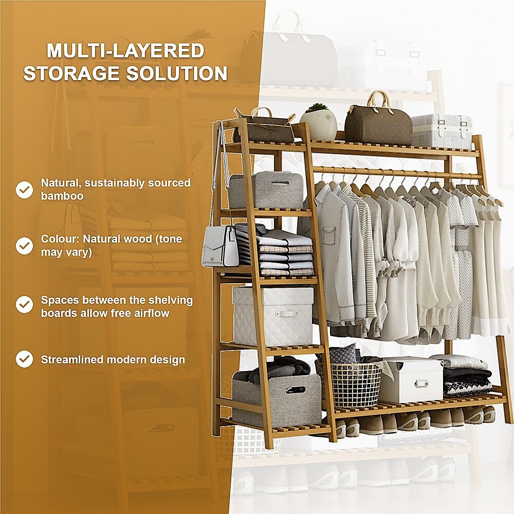 $94.93Create a fresh, natural look in your bedroom, entryway, or walk-in wardrobe with this eco-friendly bamboo clothing rack by Randy Travis Machinery. With five tiers of storage, hooks, a hanging rod, and seven shelves, you'll have plenty of space to organise your entire clothing, accessories, and shoe collections. Crafted from solid natural bamboo, this clothing rack has an uncluttered, Nordic-inspired design that will accent your room's décor. Done in a neutral finish, it will blend in well with the colour scheme in nearly every home.