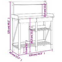 This potting bench is perfect for organising and displaying your potted plants at home, in a garden, on a patio, or on a terrace. Sturdy and durable: This garden potting table is made of solid fir wood, which makes it durable and long-lasting.Versatile storage space: The potting table with open shelves, a top rail, and a drawer provides sufficient space for related goods such as small gardening tools, soil, fertilizers, etc.Easy to clean: The zinc-covered tabletop features better water resistance and durability. You can wash it with water or wipe it clean after use without worrying about fine dirt getting into the wood grains or leaving water stains.Ventilated: This bottom shelf with a slat design can allow water flow, which is not easy to rot and has a long service life.Multiple applications: The potting workbench can not only bring a sense of nature to your space but can also be a perfect addition to your courtyard, garden, greenhouse, and more. Good to know:To make sure your outdoor furniture stays beautiful, we recommend protecting it with a waterproof cover. Warning: To prevent it from tipping over, this product must be used with the provided wall attachment device.