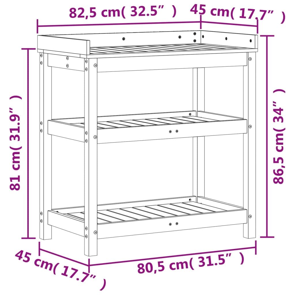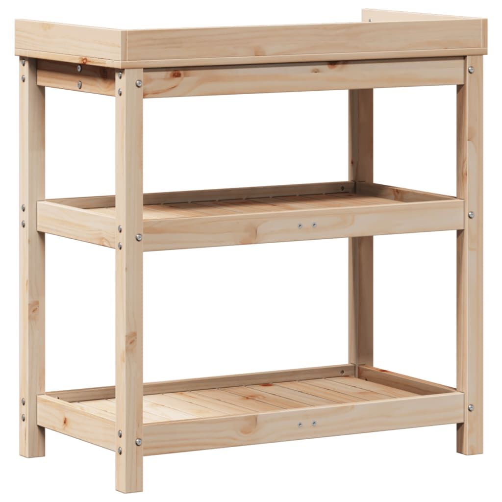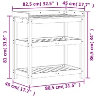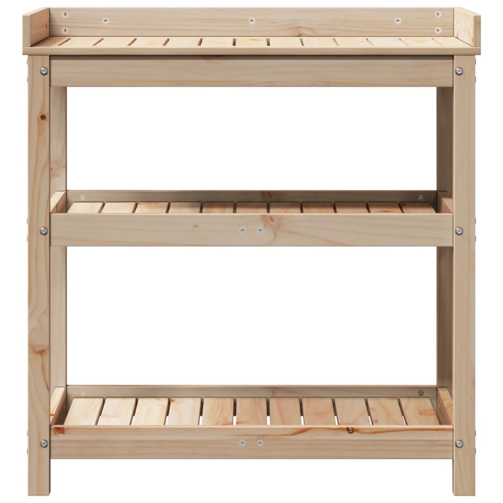 This wooden potting table is perfect for organising and displaying your potted plants at home, in a garden, on a patio, or on a terrace. Solid pine wood: The potting bench table is made of solid pine wood for sturdiness and stability. Solid pine wood is a beautiful natural material. Pine wood has a straight grain, and the knots give the material its signature, rustic look.Ample storage space: The potting workbench with open shelves provides sufficient space for related goods such as small gardening tools, soil, fertilisers, etc.Ventilated: This outdoor potting bench with a slat design allows water flow, making it not easy to rot and ensuring a long service life.Multiple applications: The potting station can not only bring a sense of nature to your space but can also be a perfect addition to your courtyard, garden, greenhouse, and more. Good to know:To make sure your outdoor furniture stays beautiful, we recommend protecting it with a waterproof cover.