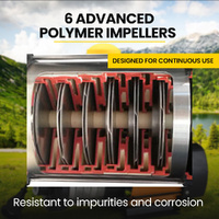 Designed for performance and built to last, the PT-MT6 pump features ease of use and is self-priming. The 6-stage Phthalate-free Advanced Polymer Impellers are mounted on a stainless steel shaft, are strong and stand up to frequent use. The body is made from safe stainless steel and mounted in robust cast iron ends. It has a 9-metre maximum suction lift and a 41-metre maximum head lift. This pump is built to last!