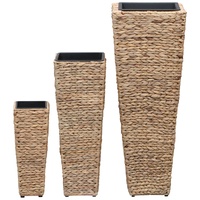 Grow and showcase flowers or plants in our rustic-style water hyacinth raised bed set! The 3 planters have different sizes which allow you to get creative as well as arrange them whatever you'd like! Made of water hyacinth, these planters are highly durable and easy-to-maintain. Additionally, the steel frame enhances the planters' sturdiness and stability. These planters are easy to clean with a damp cloth. These planters are equipped with removable plastic inner pots. Get ready to add a touch of verdure to your home with our beautiful planters! Only suitable for indoor use. Delivery includes 3 planters in different sizes.
