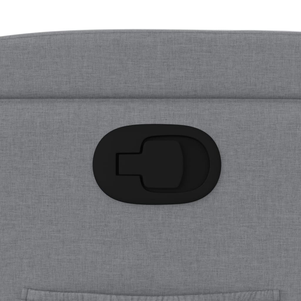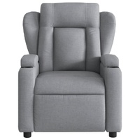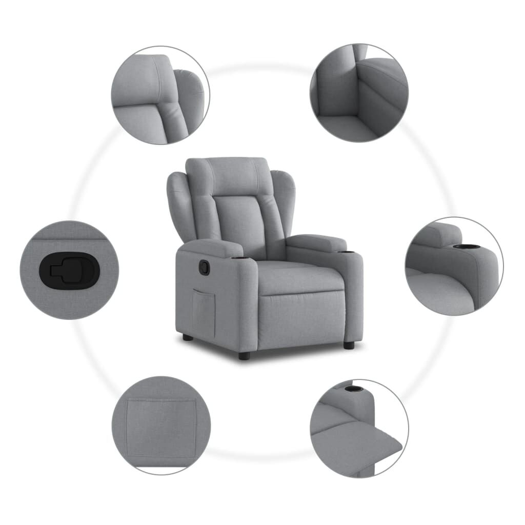 Sit back and drift away in this highly comfortable recliner chair! Manual reclining function: This reclining chair has a button on the right side. You can manually adjust the footrest and the backrest to any position as per your comfort with a simple pull of the handle. This feature allows for a maximum tilt of 135 degrees. Additionally, the backrest can go quickly back to the original place with an easy pull of the handle.Comfortable seat experience: The thickly padded seat, backrest, and wide armrests covered in fabric provide a cosy and warm sensation, making you feel embraced while seated. The fabric features a simple and clean look and is breathable and durable.Convenient cup holders and side pocket: This armchair has two convenient cup holders for your drinks and a side pocket for you to keep your essential items within easy reach.Solid and stable frame: The frame made of wood and metal provides a strong structure and stability. This reclining armchair is comfortable and durable.