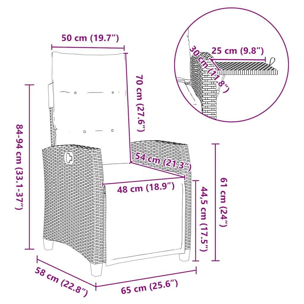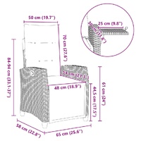 Relax and enjoy the outdoors in this comfortable reclining garden chair! Durable material: PE rattan, also known as poly rattan, is a strong, low-maintenance synthetic material that looks like natural rattan. It's lightweight, easy to clean, and commonly used for outdoor furniture due to its durability and weather-resistant properties.Adjustable backrest: This garden seat has a handle. You can adjust the backrest to any position by pulling the handle, and quickly return them to their original positions.Convenient side table: This outdoor furniture features a foldable side table with a gas spring on the armrest, providing a convenient spot to keep your essentials within easy reach.Comfortable seat experience: This outdoor furniture, complete with thickly padded cushions, offers a comfortable seating experience.Removable and washable cover: The seat cushion features a removable cover for easy washing and maintenance. The back cushion has a flap at the back for easy attachment to the backrest. Good to know:To make sure your outdoor furniture stays beautiful, we recommend protecting it with a waterproof cover.