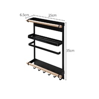 [Versatile and Space-Saving] -- Magnetic fridge organizer multi-level collection, two-tier shelves hold bottles and jars, two removable wooden sticks perfectly hang plastic wraps and paper towel rolls and the bottom end has six fixed hooks. Keep countertops well organized and instantly frees counter and cabinet space.
