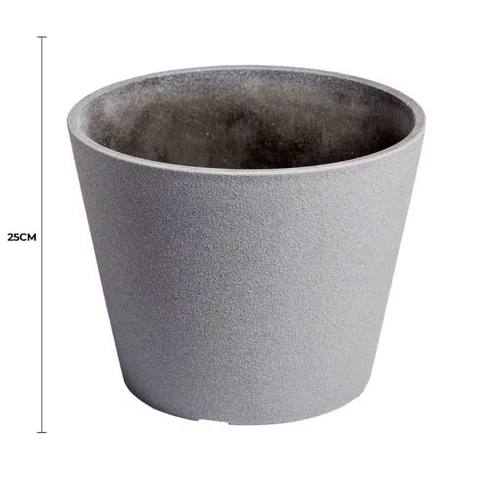 This hand-rendered plastic garden pot is made from exceptionally high-quality recycled materials that exceed the performance of most traditional pots and planters. The environmentally friendly round planter is the perfect choice for anybody wanting a low-maintenance planter for either indoors or outdoors that will last for years. Finished with a simply stunning rough textured surface youll absolutely love this super planter. The natural grey colour is perfect for any modern spaces.