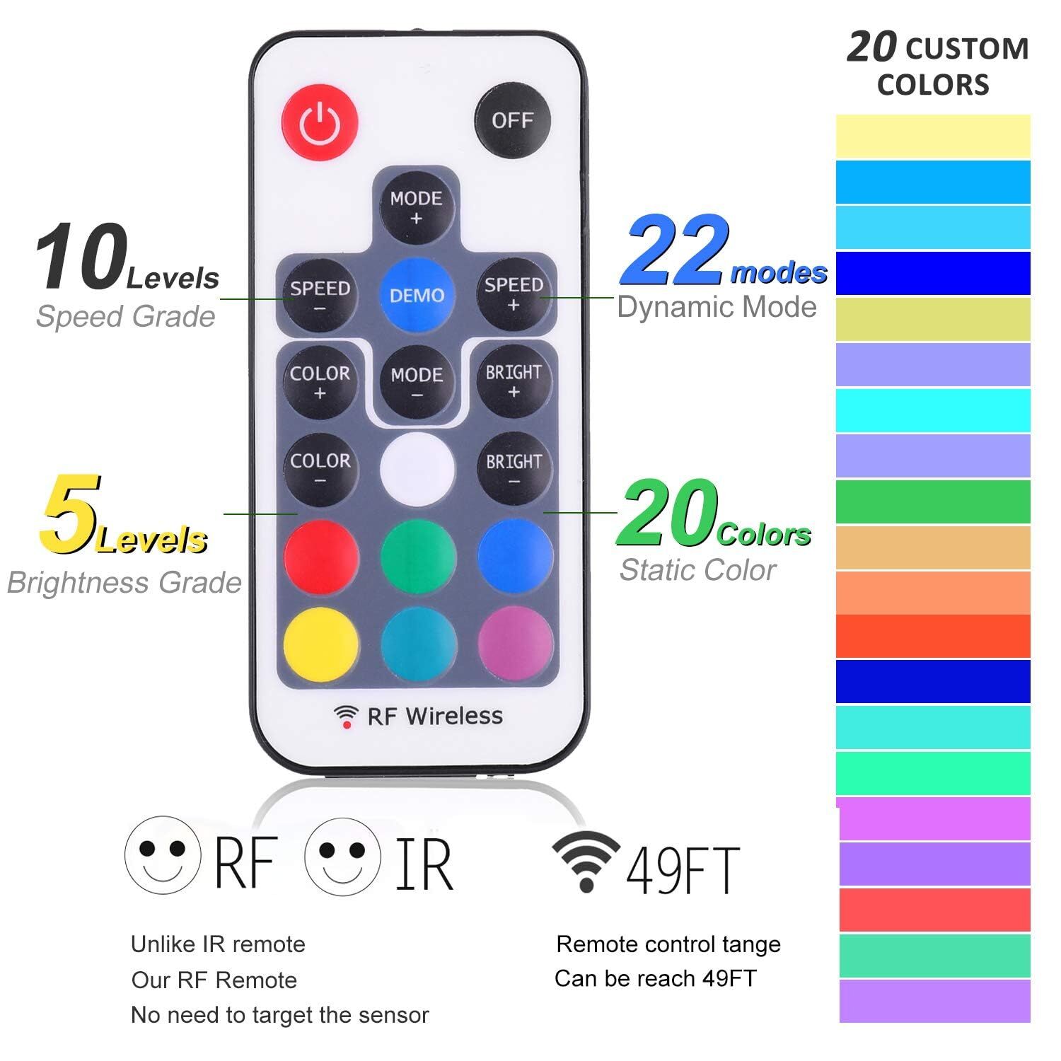 Dimmable and safe:20 static colors, 19 dynamic modes, dimmable with RF remote control, DC adapter, safe to touch.