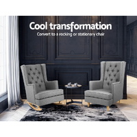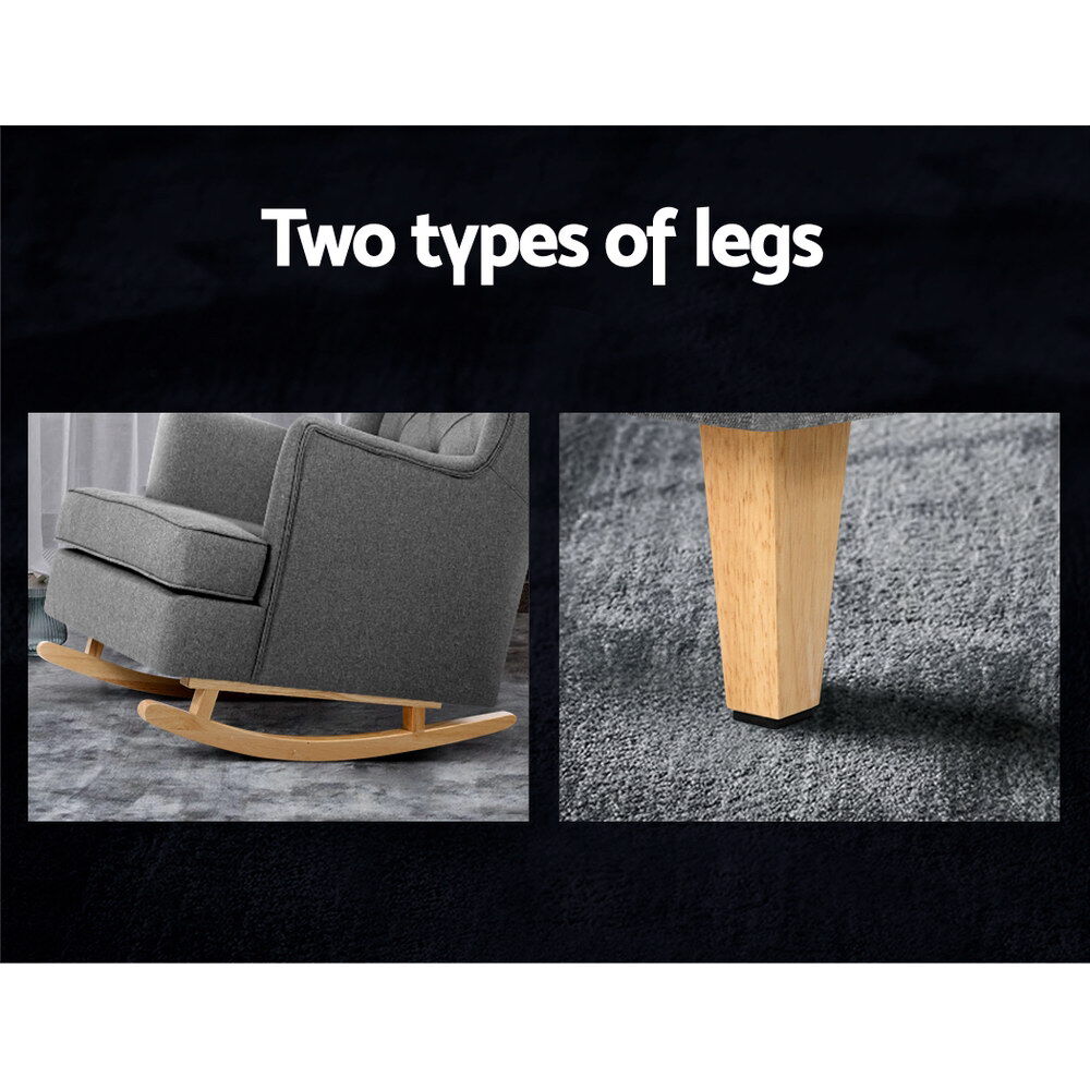 $254.73Be swayed. Rock on and relax with our Artiss Gaia Rocking Chair. It comes with two sets of removable legs so that you can use it as a rocking chair or a stationary chair. The gentle swaying of the rocking chair would be perfect for reading, listening to music, taking a much-needed nap, or even rocking your baby to sleep. Or simply swap the legs over and you have a classic accent chair. The iconic design and the tufted wingback exude elegance and timeless appeal. This makes the chair suitable for any décor, from your living room to your nursery. The extra thick foam padding and wide back ensure ultimate comfort with exceptional support. The armchair feet are fitted with pads to keep your floors pristine from scratches and damage. Together with a reinforced wooden frame and quality faux linen fabric upholstery, our armchair is guaranteed to stand up to durable use for many years to come.