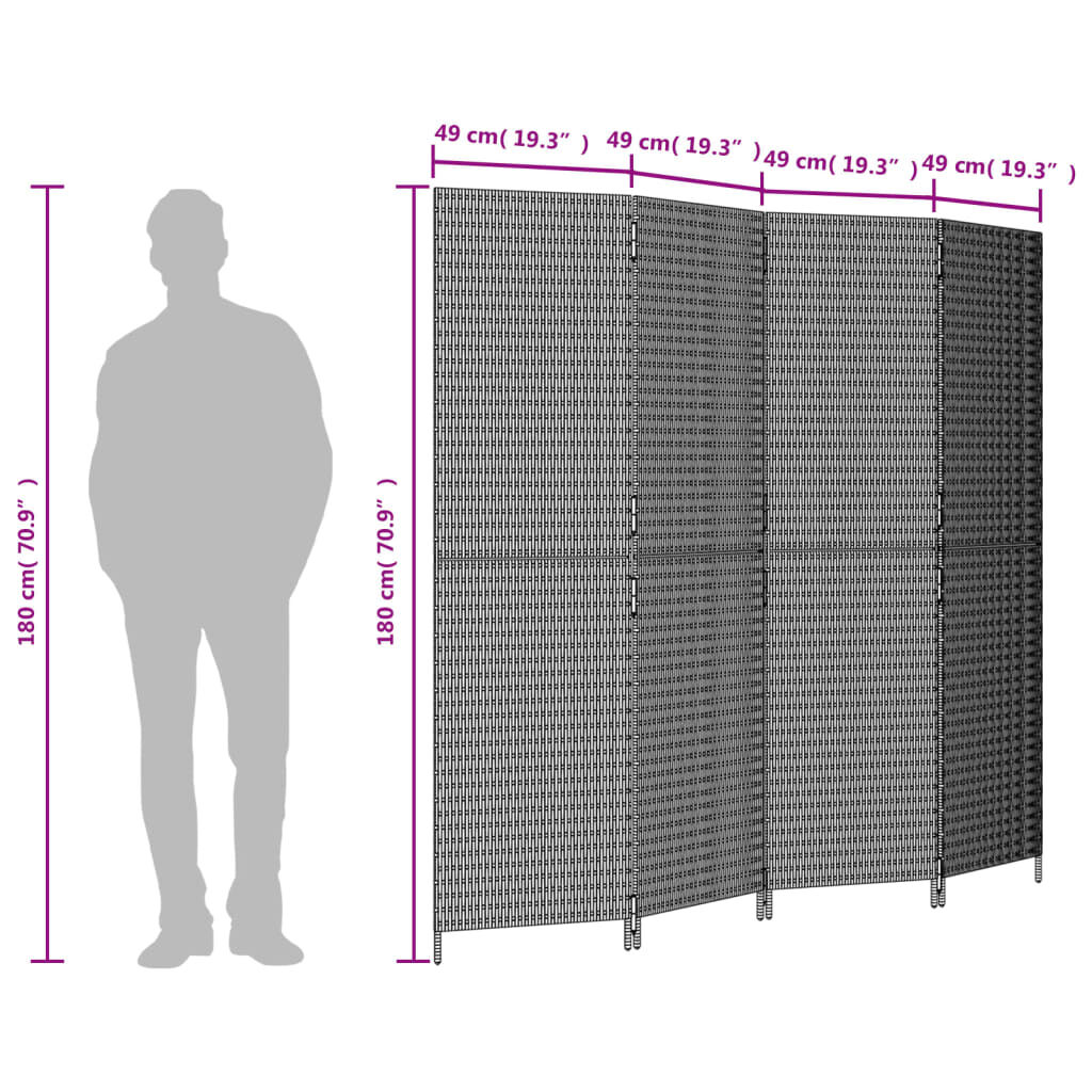 Decorate your home and divide up your space with this poly rattan room divider. Durable and easy to clean: Each privacy screen panel is woven from weather-resistant and durable poly rattan stripes, providing a beautiful appearance and making it easy to clean.Stable frame: The powder-coated steel frame ensures sturdiness and stability.Flexible and easy to fold: Each partition is connected by galvanised hinges and can be easily folded to some extent according to your needs to save space.Multipurpose: The room divider screen is great for creating private space both indoors and outdoors, such as a bedroom, living room, office, etc. You can also place it in front of a window to block intense sunlight.