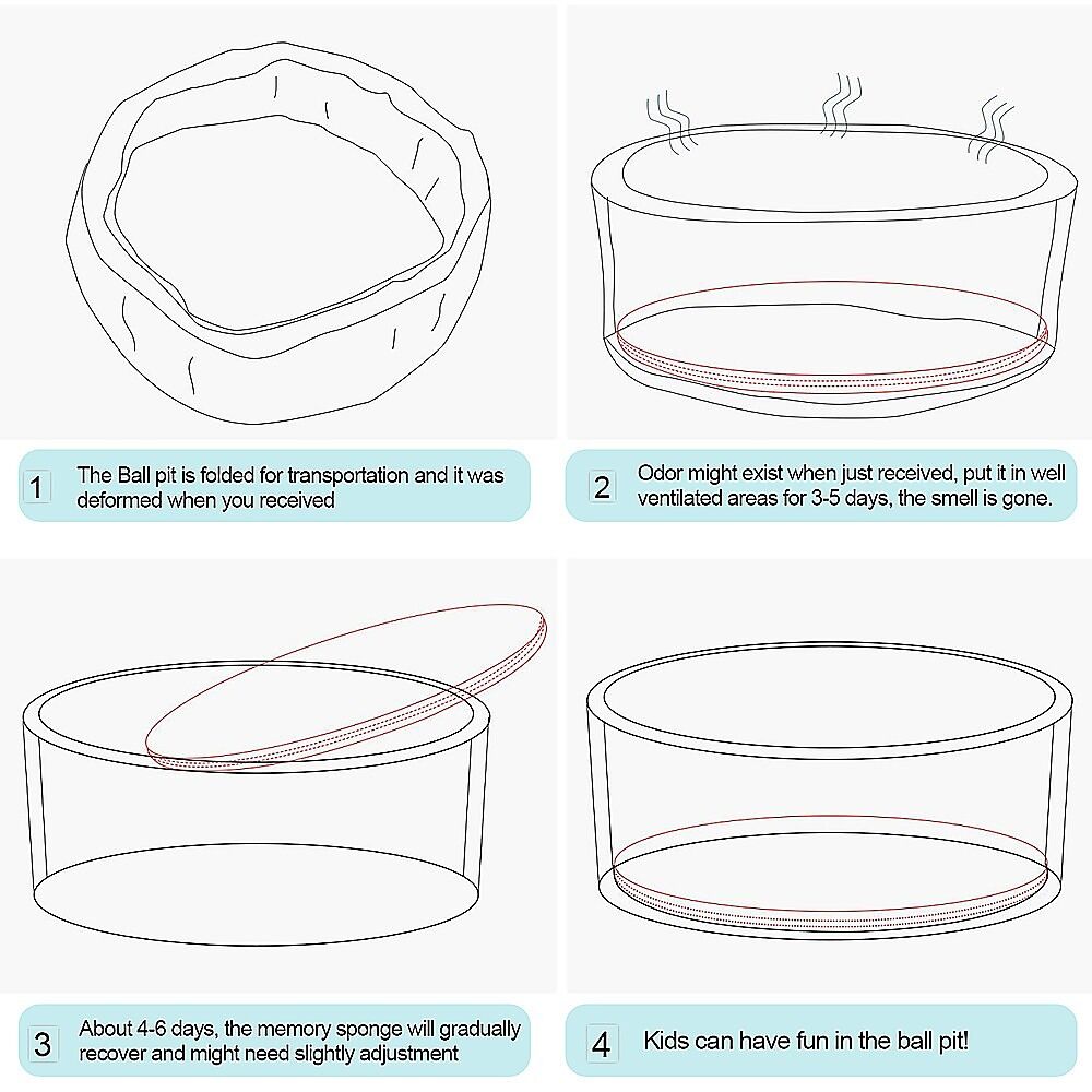 The ball pit is vacuum-sealed for efficient transport. Upon unboxing, the foam will expand but may not form a perfect circle immediately. Allow 48 hours for it to regain its shape. If needed, use the cold air mode of a hairdryer to help restore its shape.