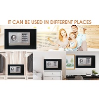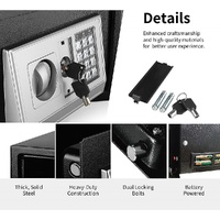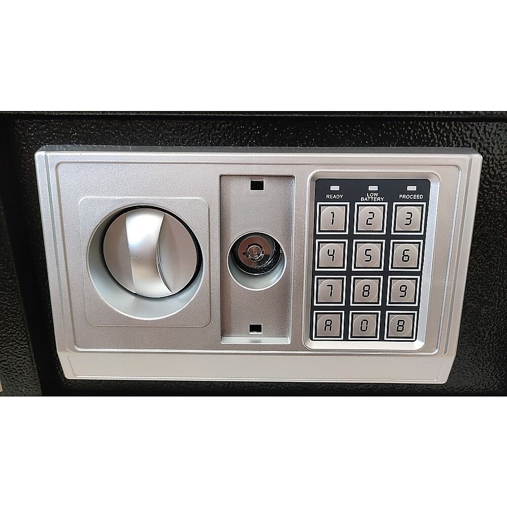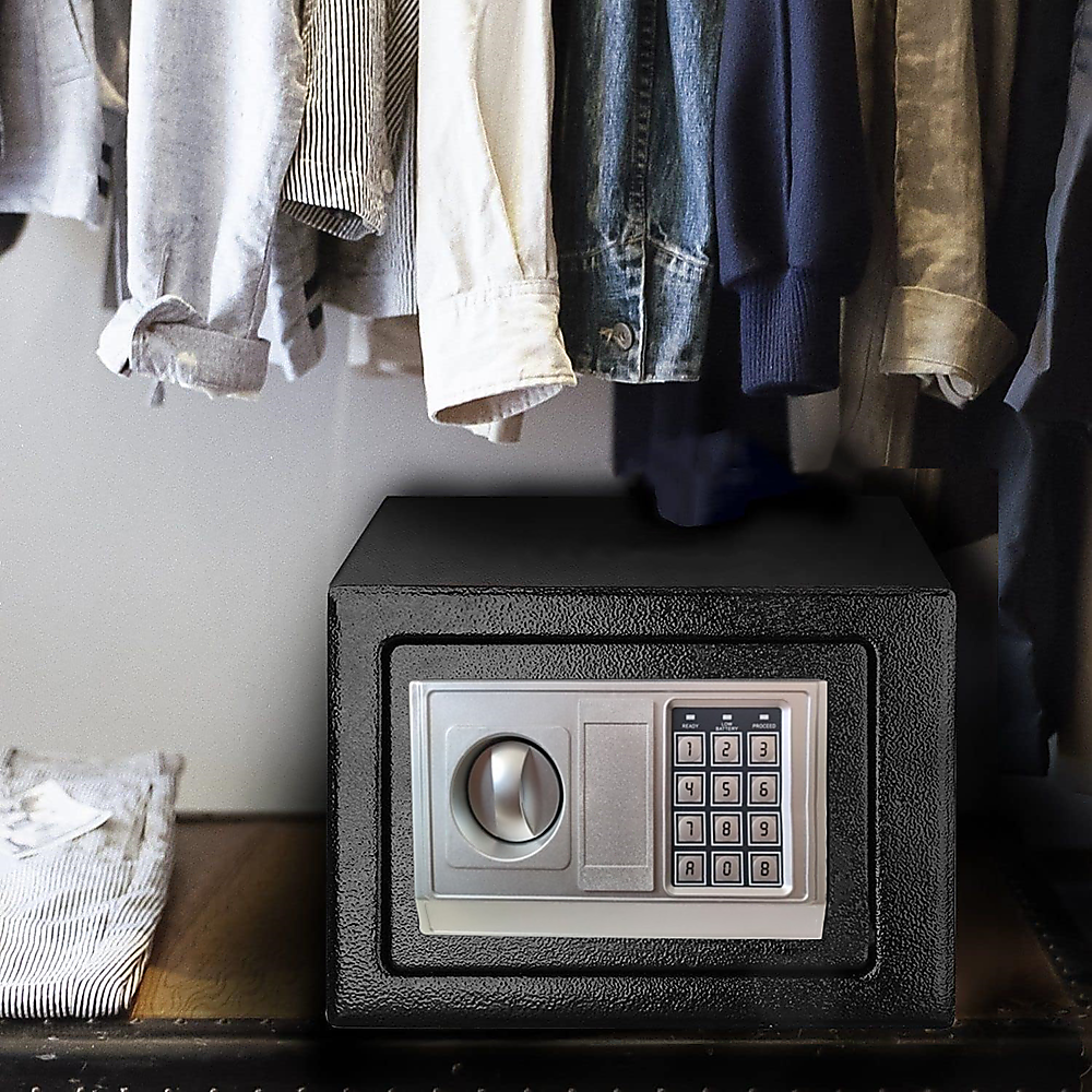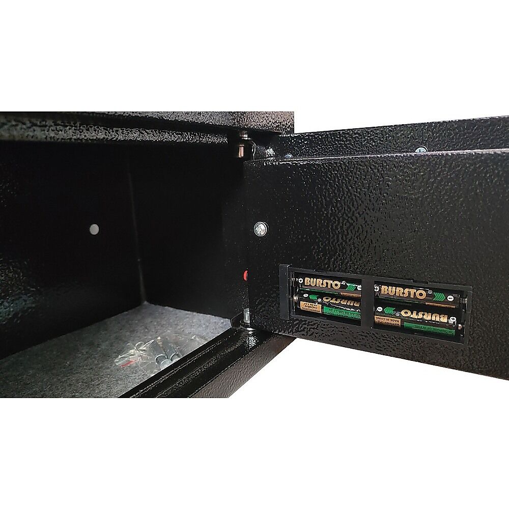 Internally, the safe is lined with carpeting and offers ample space to accommodate various items, ranging from jewelry and cash to important documents. To provide complete peace of mind, the safe is equipped with an automatic alarm that activates if three consecutive incorrect entries are made. You have the flexibility to use this safe as a freestanding unit or mount it on a wall, thanks to pre-drilled holes that cater to your specific requirements.