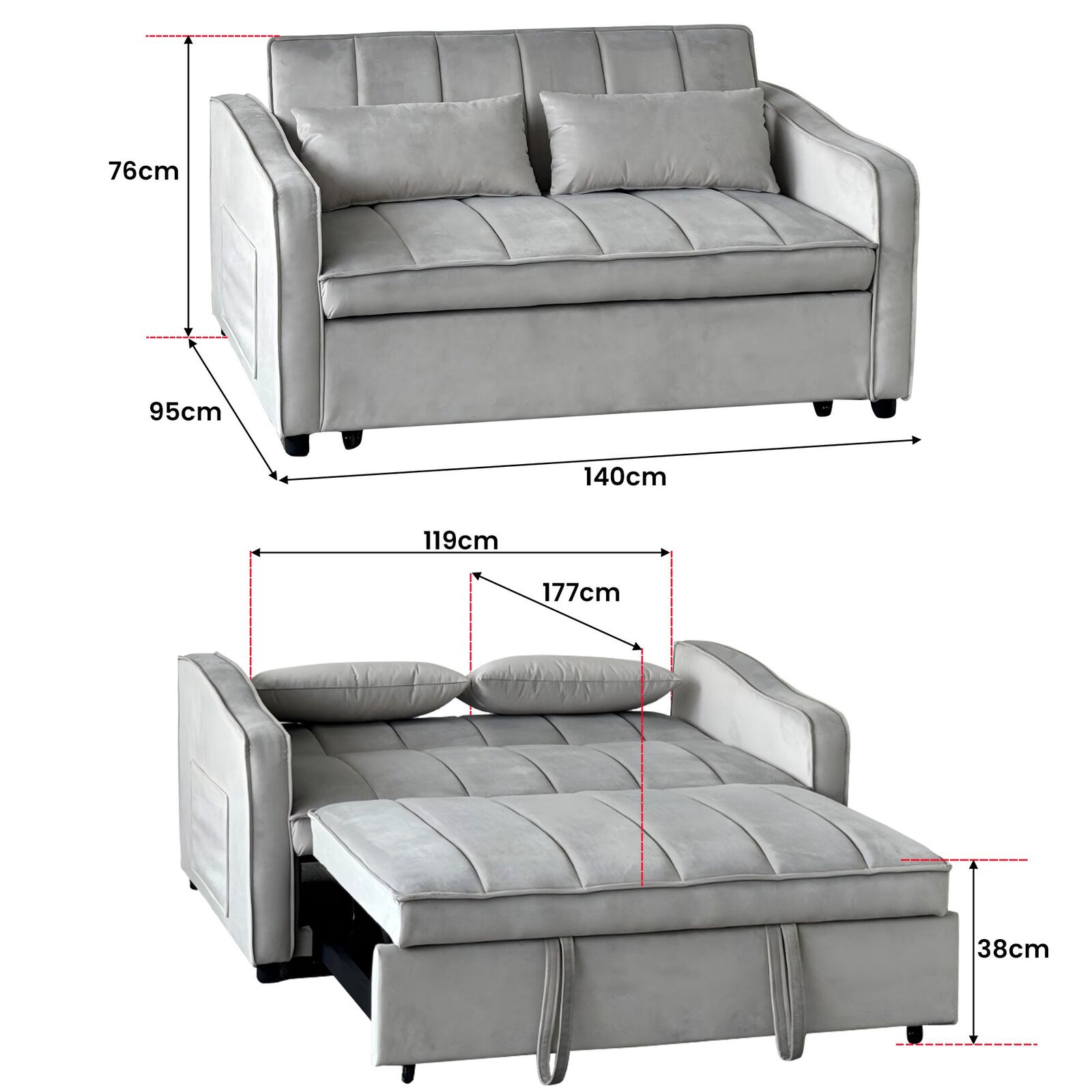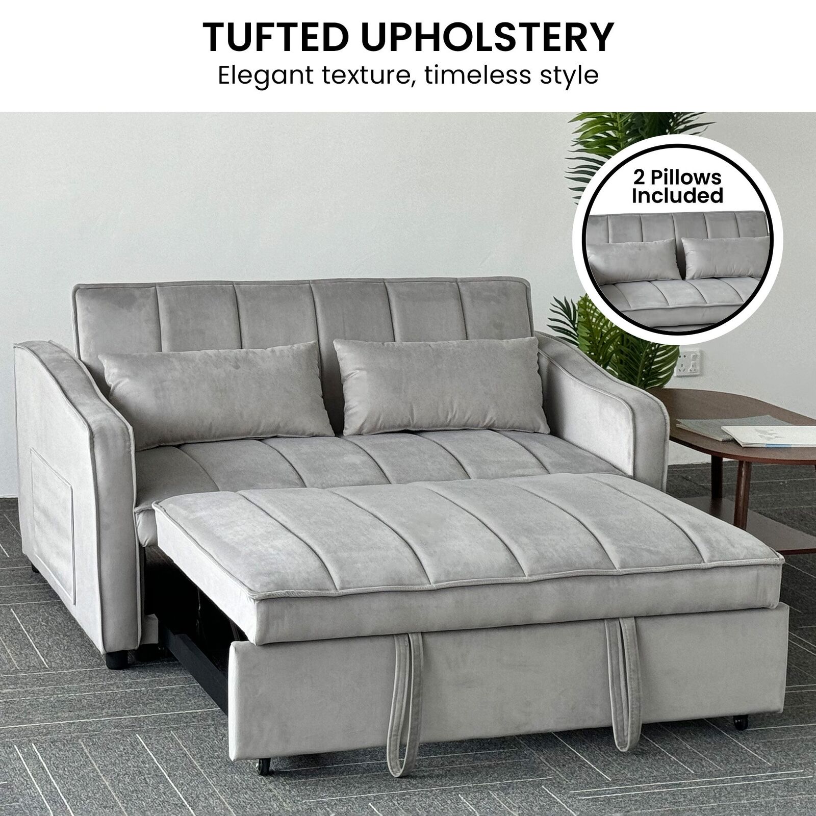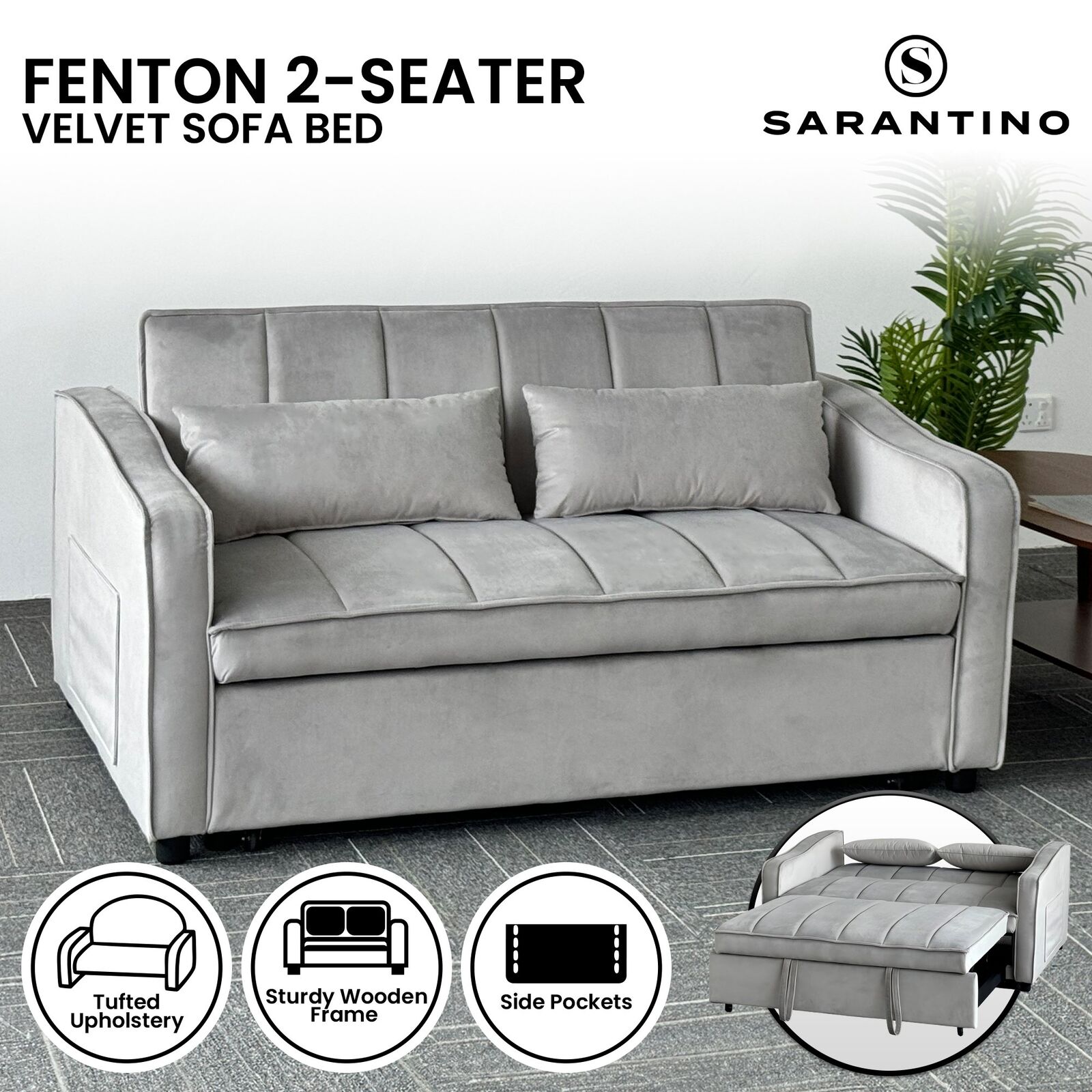 Maximise your space with the stylish Fenton Two-Seater Sofa Bed by Sarantino. This sofa easily changes from a chic sofa to a comfy bed, so its perfect for hosting friends or just kicking back at home. Its built with a solid wood frame, sleek plastic legs and comfy tufted padding for great durability and chic design. Wrapped in soft velvet, it comes with two cosy pillows for extra comfort.