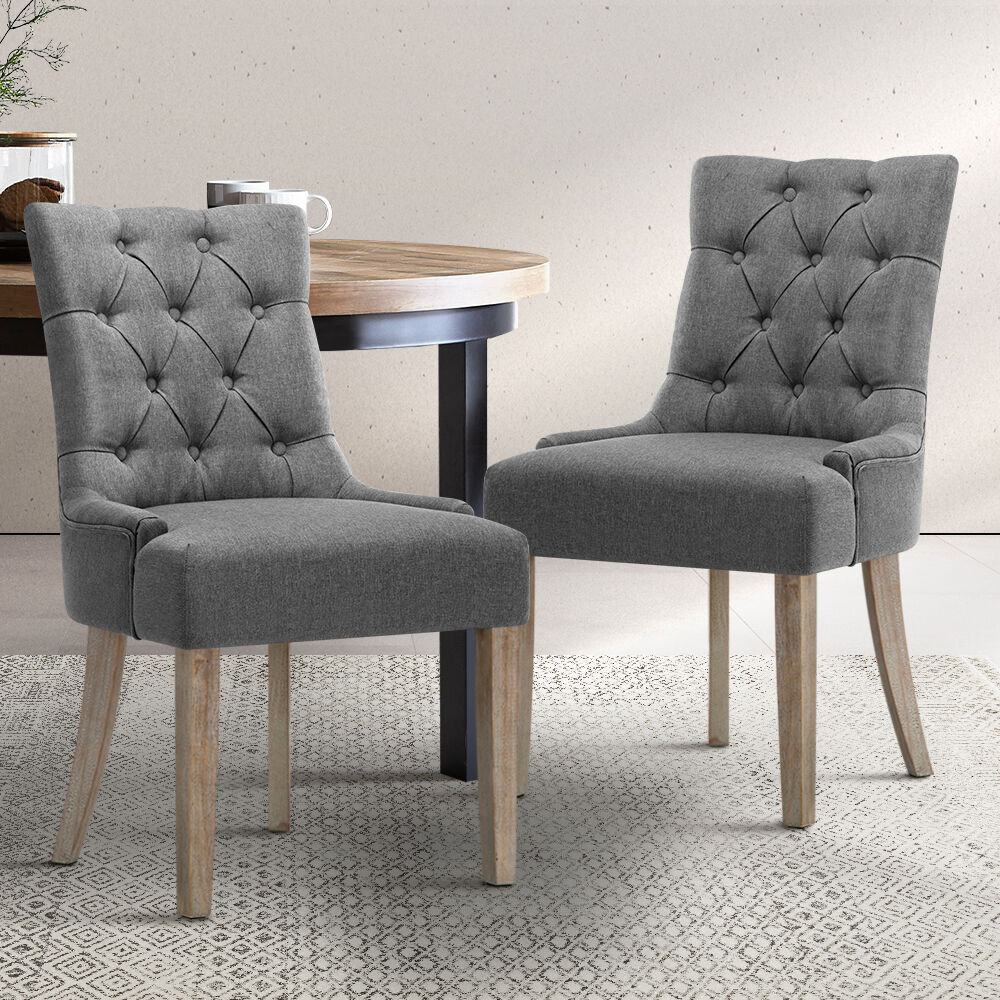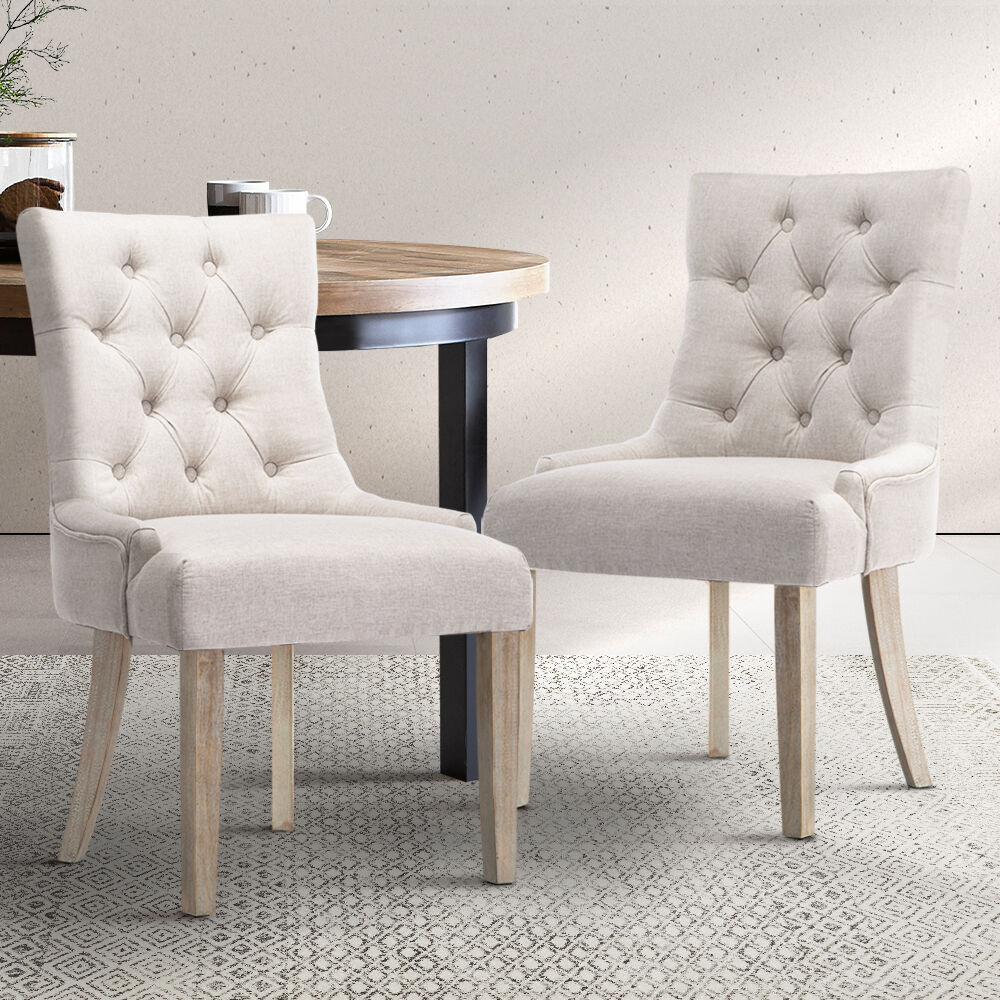 Transform your home with French Provincial charm with our timeless Cayes Dining Chair. Oozing myriads of class and sophistication, the Cayes Dining Chair is upholstered in quality amber taupe linen over deep 13cm high resilience foam and set over a rubber wood frame.The tufted button design of the back rest, and the iconic curved back legs and turned front legs all add to the overall charisma of this classic chair.If there’s a symbol that characterises Provincial elegance eloquently, the Cayes French Provincial Dining Chair undoubtedly takes the front seat.