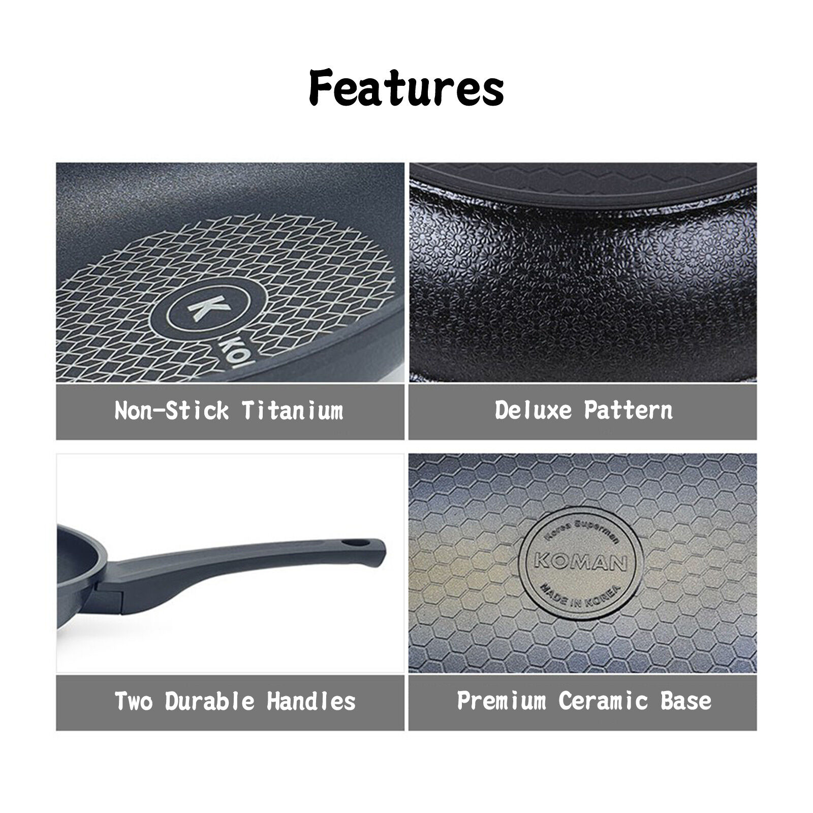 Internal and external 6 layers coating - Reinforced with a strong and robust titanium coating for heavy non-stick black coating, reducing the frictional force of the coating surface for excellent coating and cleaning power. The release of the raw infrared radiation gives the deep flavor of the dish.