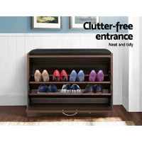 $68.61Get yourself a shoe cabinet with an aesthetic difference. Our Artiss Shoe Storage Bench adds a touch of luxury and multi-functionality to the ubiquitous shoe cabinet. On first impression, it looks just like a plush PU leather stool. Pull down the front panel and you find three tiers of adjustable shoe shelves with ample space for up to 15 pairs of various footwear (depending on shoe sizes). Made from quality particle board, the bench is sturdy and finished in melamine for durability and easy maintenance. Not least, its thoughtful design means that you can place it in your hallway or entrance for a neat and tidy look that blends seamlessly with your home decor. So remove the clutter and get organised with our shoe storage bench. We are sure it will fit right in with your discerning taste for all things stylish and chic.