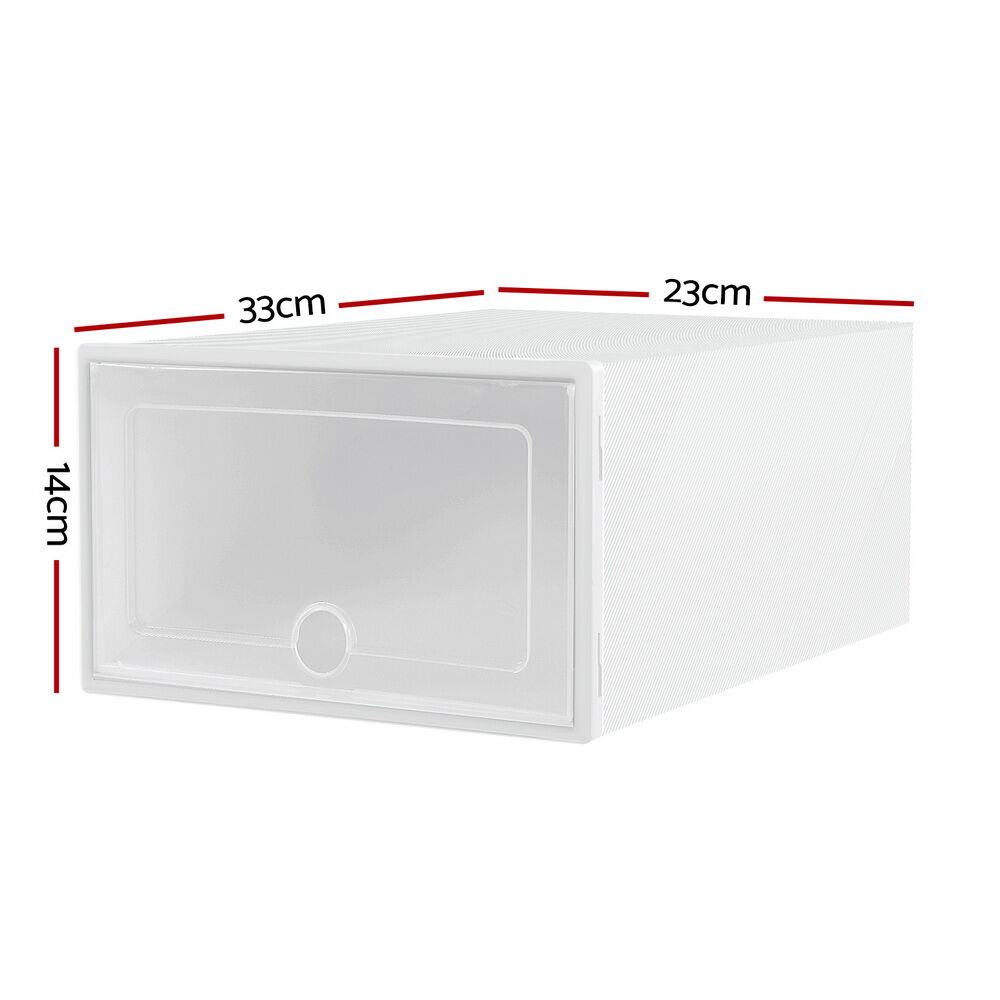For home shoe storage, you can't beat the Abel Shoe Storage Boxes from Artiss. With a foldable and stackable design, these shoe boxes are not only space-saving but also incredibly convenient. Made from premium PP plastic, they are durable and can hold up to 5kg of weight per box. Each box is easily washable thanks to its smooth surface. The ventilated hole ensures proper air circulation, keeping your shoes fresh and odour-free. The clear flip-out lid allows for easy access to your shoes, while the multifunctional design makes them suitable for various uses. Assembly is a breeze, making these shoe boxes a hassle-free addition to your home. With Abel shoe boxes, you can keep your shoes organized and protected in style.