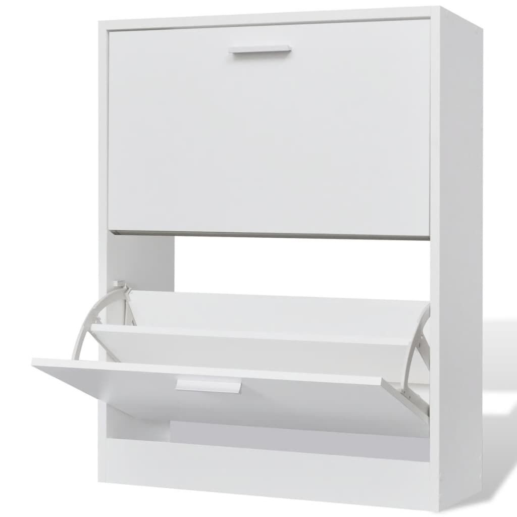 $124.07This wooden shoe cabinet has 2 storage compartments and a simple, yet stylish design. You will no longer be annoyed by shoes cluttering your floor. Each large compartment has a middle partition to keep things organised. Up to 12 pairs of shoes can be stored dust-free. Made of high quality wood, our shoe cabinet is easy to assemble.