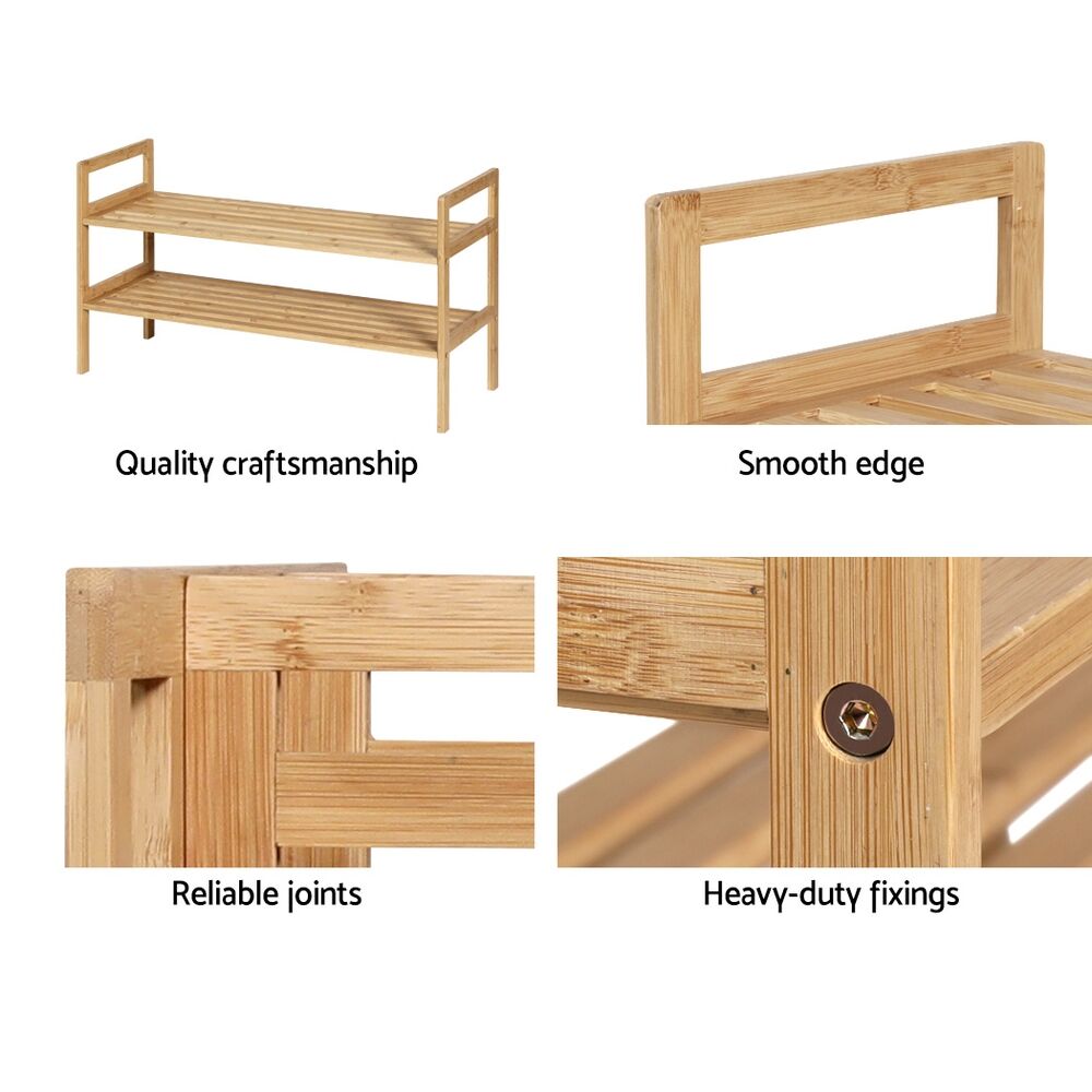 The Artiss Hina Shoe Rack will help you keep the home neat and tidy without compromising on style. With its sturdy quality bamboo frame and smooth, clean surface, you can trust the shoe rack to keep your daily essentials at hand. natural wood grain colour will blend in with most interior styles. The two-tier open shelves give you plenty of room for essentials, while gaps along each shelf encourage proper airflow to prevent dampness, mould and mildew. The rack can store up to six pairs of shoes to keep the whole family organized. With simple assembly instructions, your hallways will be clutter-free in no time. Get yourself an Artiss Hina Shoe Rack and never lose your shoes at home again.