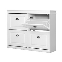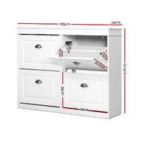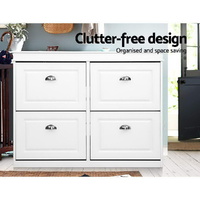 $148.51You are shoe proud. That is why you need ample space for all that wonderful footwear. Organise and save your floor space with our Shoe Cabinet and have a clutter-free entrance at all times. The four storage compartments are pull-down for easy access and have two tiers of adjustable shelves so that they can fit different footwear of various shapes and sizes. In fact, up to 16 of your favourite pairs would fit comfortably in it. Made of premium E1 MDF with smooth NC lacquer finish, the shoe cabinet is strong and durable to withstand daily robust use. Not least, its classic design, with beautiful retro-style metal cup pull handles, definitely lends a touch of elegance to any home.